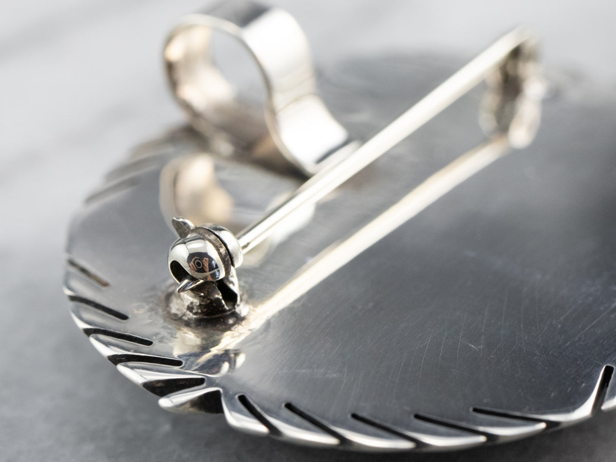 The jasper at the center of this sterling silver brooch or pendant is a rich green confection of waving lines, a beautiful oval of jet black, and brick red-hued stripes. The sterling silver bezel set frame features tribal linear style cutouts, creating a simple yet bold motif!