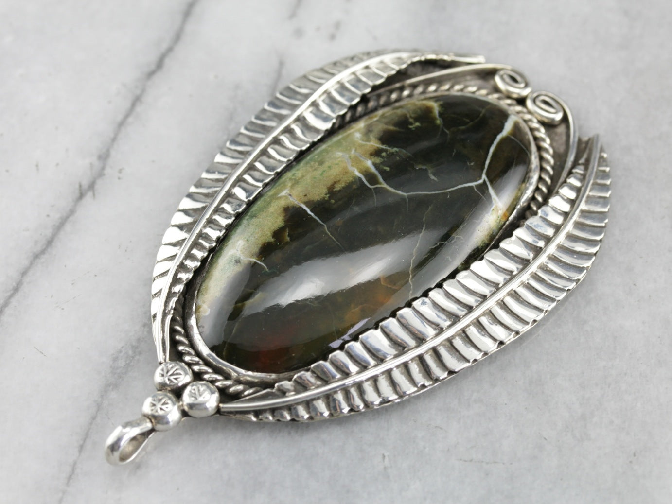 A jasper cabochon in earthy tones of brick red, burgundy, orange, and gold shades sits at the center of this gorgeous sterling silver pendant. The framework dates to the mid-1900s, a large piece, a perfect statement piece for a man or woman!