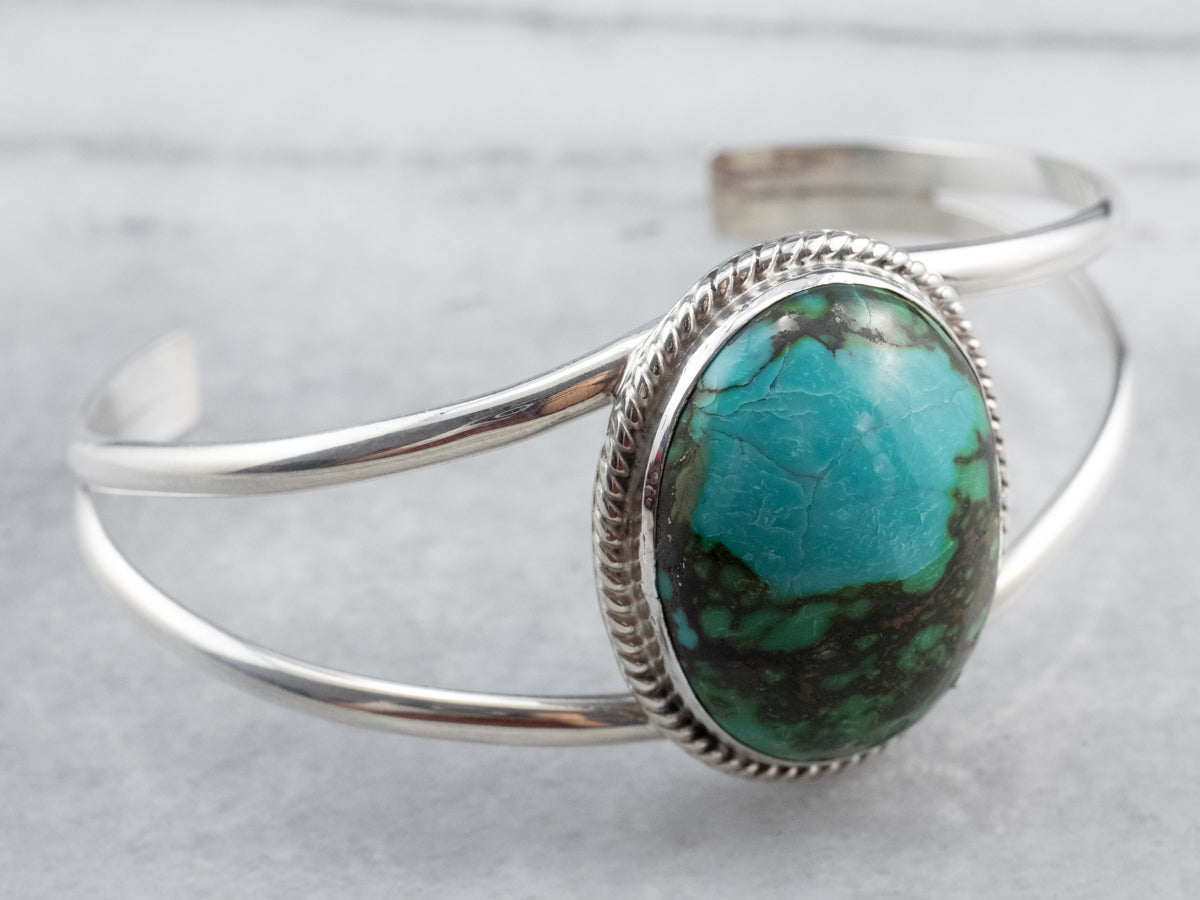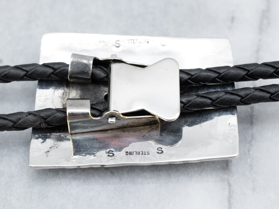 This is a beautiful example of vintage sterling workmanship from the Southwestern USA. The arrowhead centerpiece is adorned with a handsome turquoise cabochon. This gem is expertly set into a sterling silver bolo with braided leather straps!