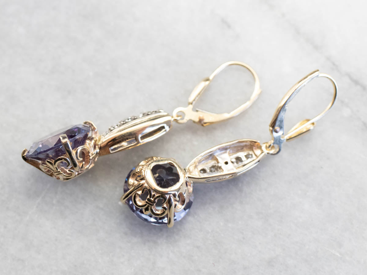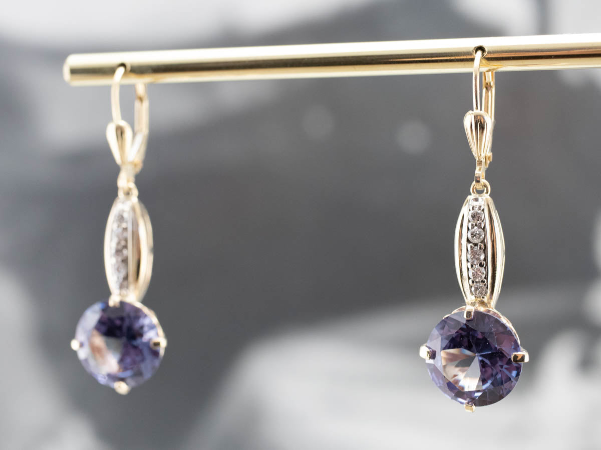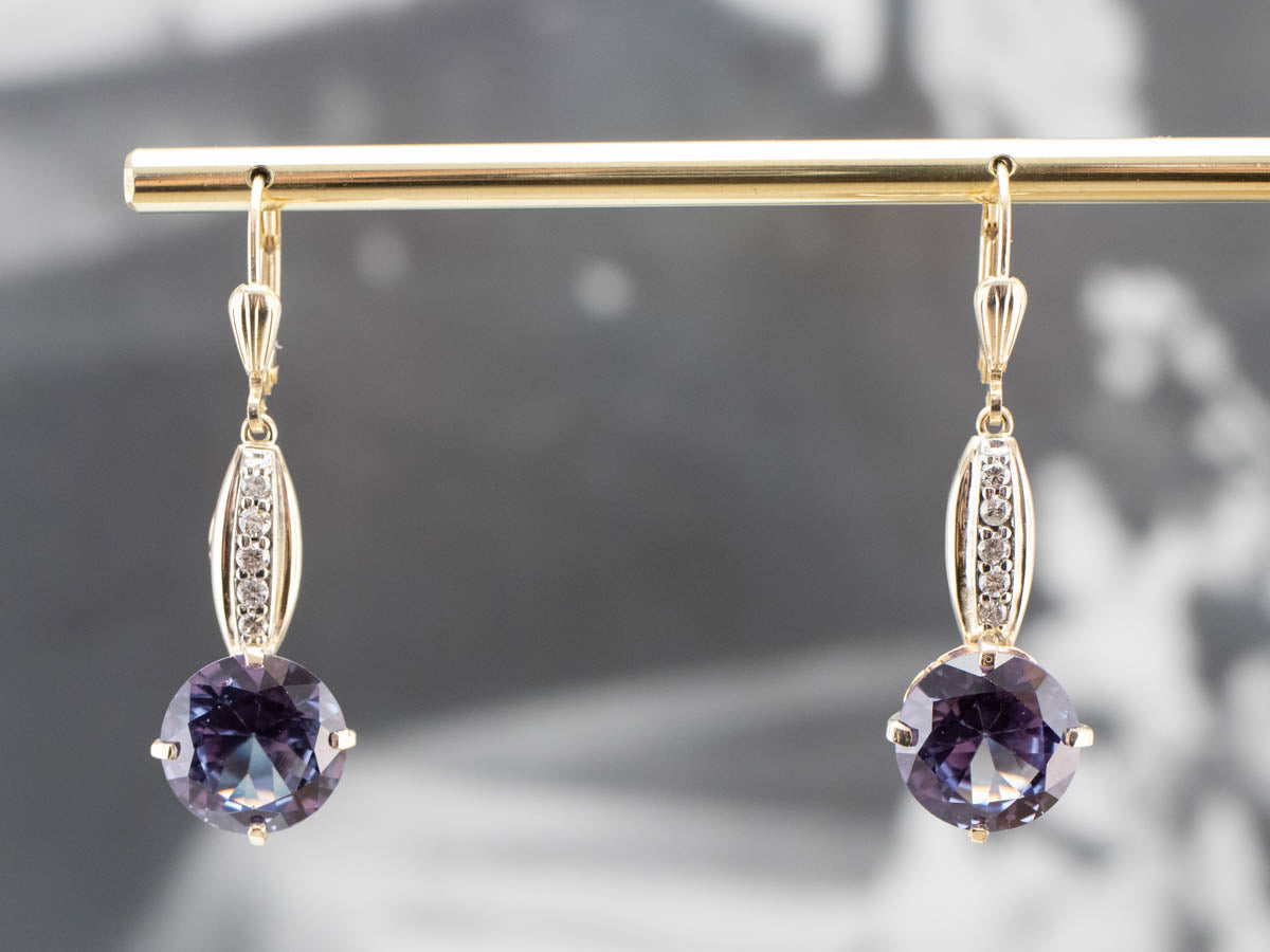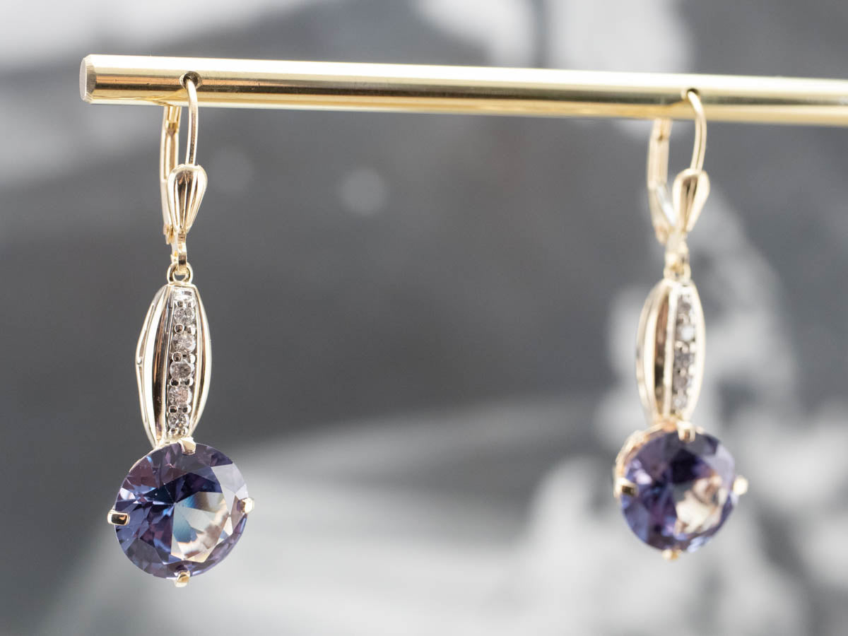 ¡Sencillo y elegante! Estas gotas de oro pulido están maravillosamente pulidas y revestidas con diamantes brillantes. Una cabeza suave y de filigrana se combina con cuatro puntas estructurales para sostener una hermosa piedra de alejandrita sintética. Las puntas aseguran y enmarcan la piedra, dejando pasar mucha luz. La alejandrita sintética es una piedra que cambia de color y reflejará tonos de púrpura majestuoso a verde azulado dependiendo de la luz que incide sobre la piedra.