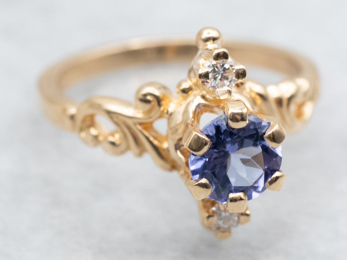 The center stone is deep cool blue-purple with an amazing amount of flash and light coming through the center. To add to this ring's luxurious aura, two brilliant round diamonds, as well as four dainty diamonds, have been set into the shoulders. This is truly a stunning piece.