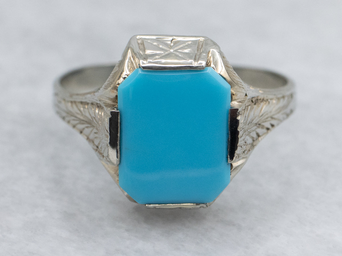 A refined solitaire design showcasing a newly set stabilized turquoise cabochon in a meticulously engraved white-gold setting, inspired by Art Deco craftsmanship. This antique piece combines the distinctive character of turquoise with the timeless elegance of hand-detailed metalwork, creating a sophisticated statement ring with historical charm and enduring appeal.