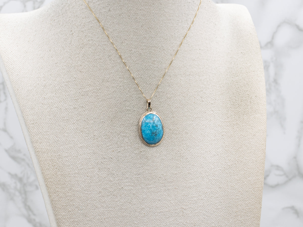 Metal: 14K Yellow Gold Gem: Stabilized Turquoise Gem Measurements: 15.1 x 20.8 mm, Oval Cut Measurements: 19 x 33 mm, with bail Marks: "14K" Stamped on the reverse