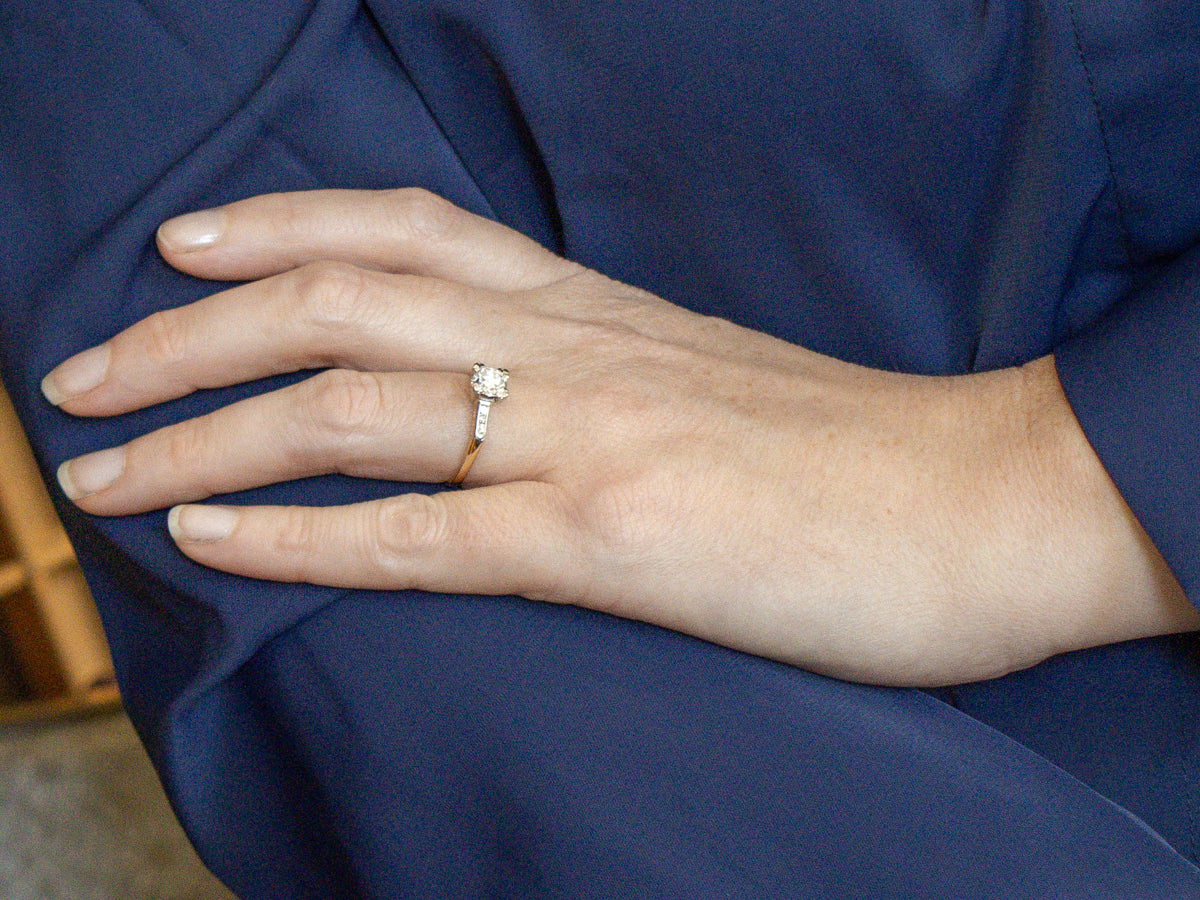 This vintage piece is exquisite! The classic white gold head allows the diamonds to twinkle, while the warm yellow gold brings out the shine. The center diamond is a newly set brilliant cut, with melee diamonds on either side, bringing lots of sparkle!