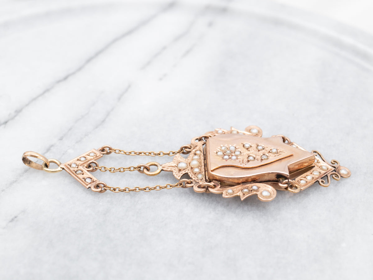 This stunning locket is crafted from a combination of bloomed gold and rose gold. This intricate locket features a classic vintage Etruscan Revival design, perfect for any antique jewelry enthusiast.