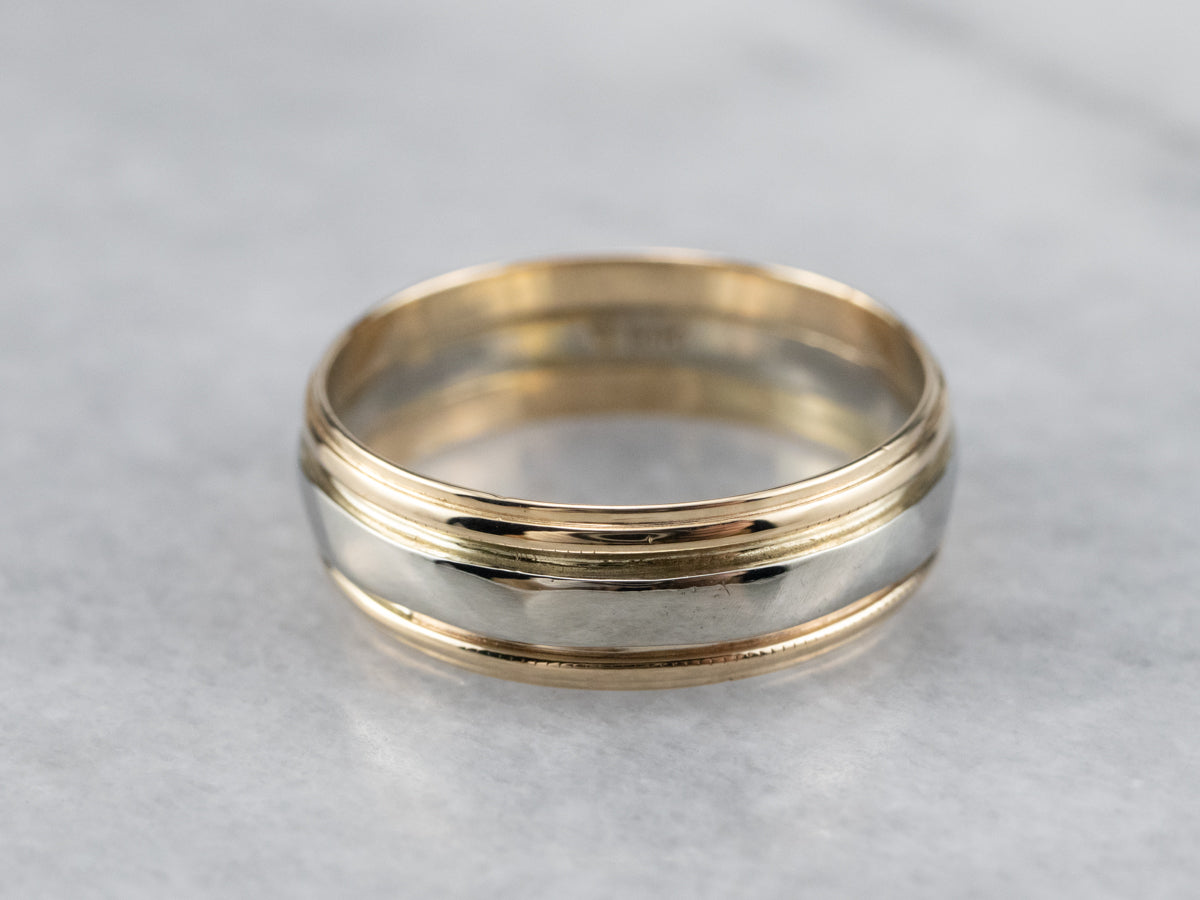¡Esta alianza vintage tiene un diseño de dos tonos que hace que sea fácil de combinar con una variedad de otros anillos! Sencilla y atemporal, esta banda no tiene adornos excepto sutiles detalles milgrain que añaden un toque de textura al elegante pulido del metal. ¡Este es un diseño unisex que se adaptaría a cualquiera!