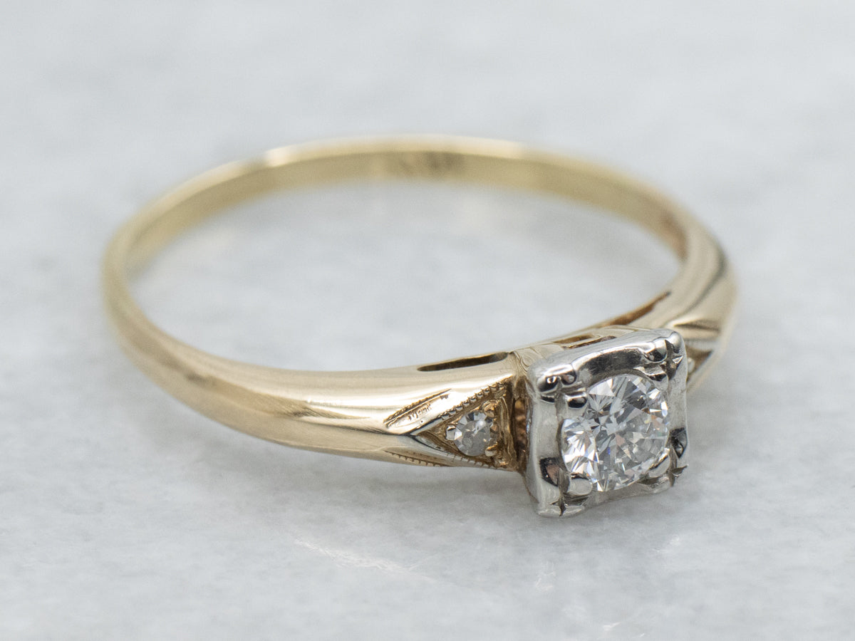 This vintage engagement ring showcases the sophisticated craftsmanship of mid-century design. The illusion-set head, rendered in white gold, creates an impressive visual presence for the center diamond while the warm yellow gold band provides elegant contrast. Delicate scalloped shoulders adorned with accent diamonds evoke a refined, botanical aesthetic characteristic of 1940s-50s jewelry. The timeless construction ensures comfortable everyday wear and pairs beautifully with period-appropriate wedding bands. A distinguished choice for those who appreciate authentic vintage artistry and enduring design.