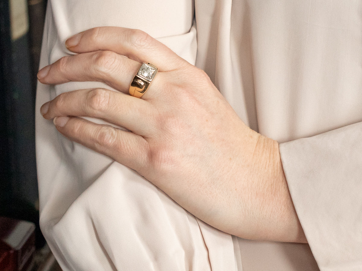 Stately yellow gold shoulders step up to a white gold head. A European cut diamond sits in the center, gleaming with fire and light. Suited for both a man and woman, this ring is ready to wear or gift!