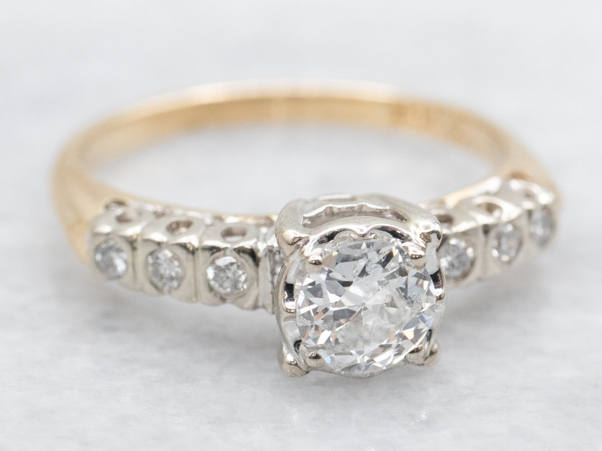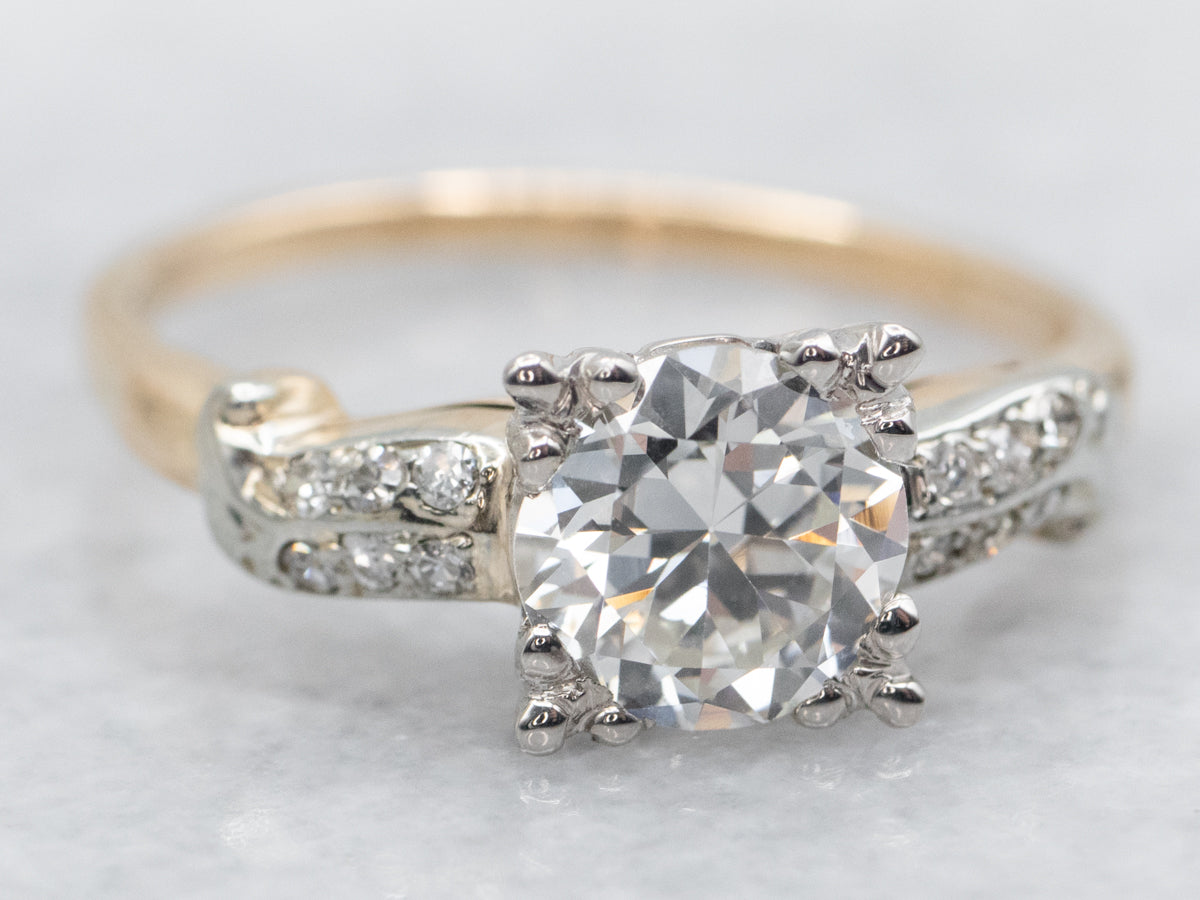 Metal: 14K Yellow and White Gold Gem: European Cut Diamond 1.58 Carats, I2 in Clarity, J in Color Gem Measurements: 7.5 mm, Round Ring Size: 9.25 Marks: "14K" Stamped on the inside band