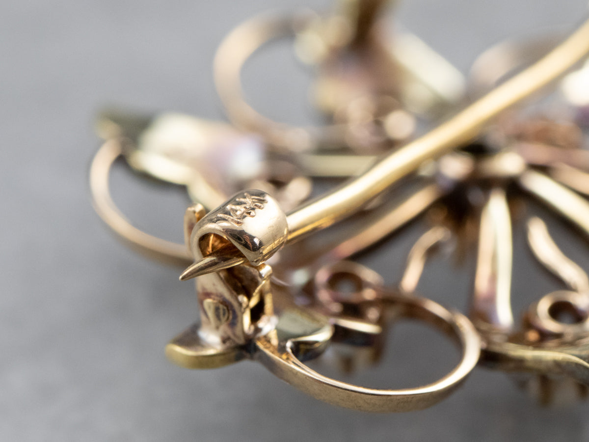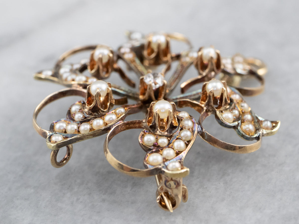 So beautiful! This rosy yellow gold piece dates to the late 1800s. It's paved with seed pearls, each one individually set in its own little mounting. The centerpiece is a small but bright old mine cut diamond. Pretty and versatile, this antique piece can be worn as a brooch or a pendant.