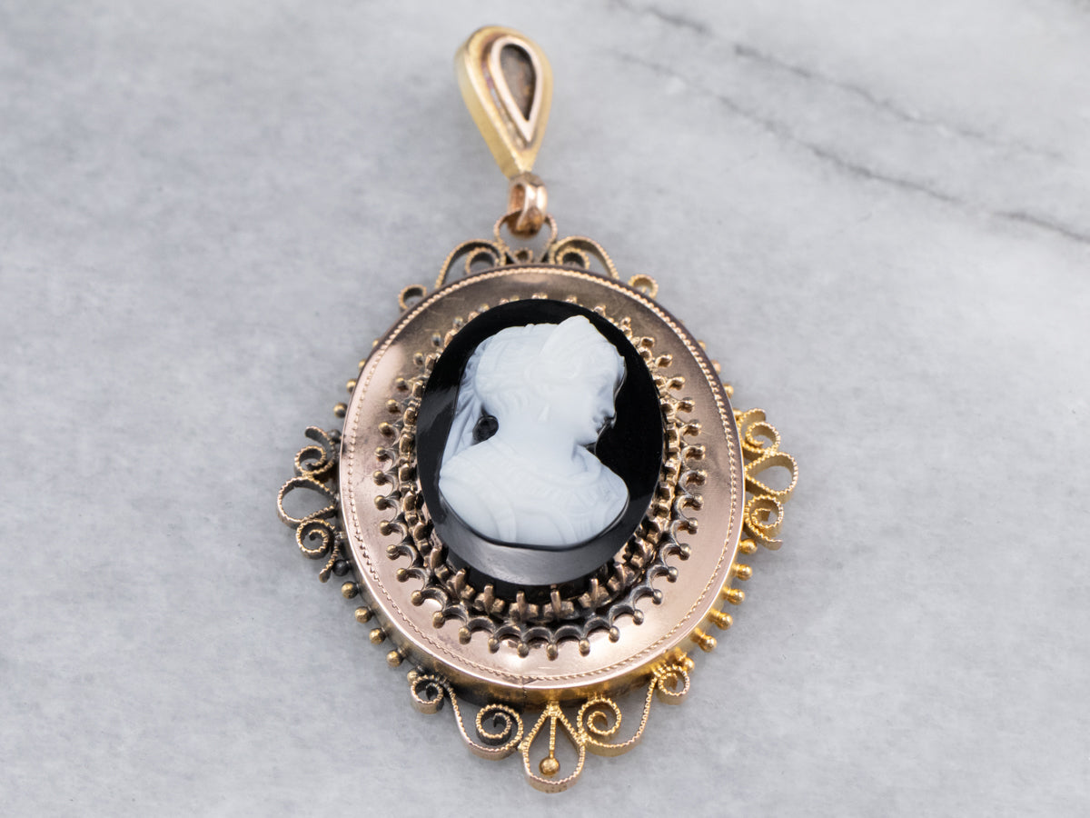 Crafted with a striking black onyx cameo and elegant seed pearls, this pendant captures the opulence of the Victorian era. Make a statement with this timeless onyx cameo pendant. The contrasting colors of the black and white cameo design are beautifully complimented by delicate seed pearls.