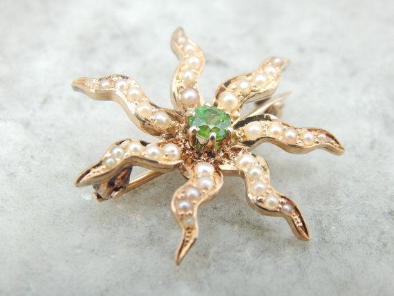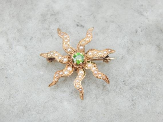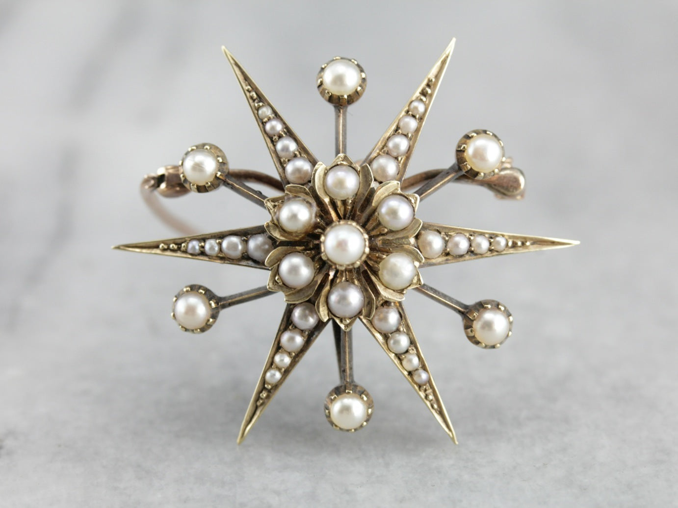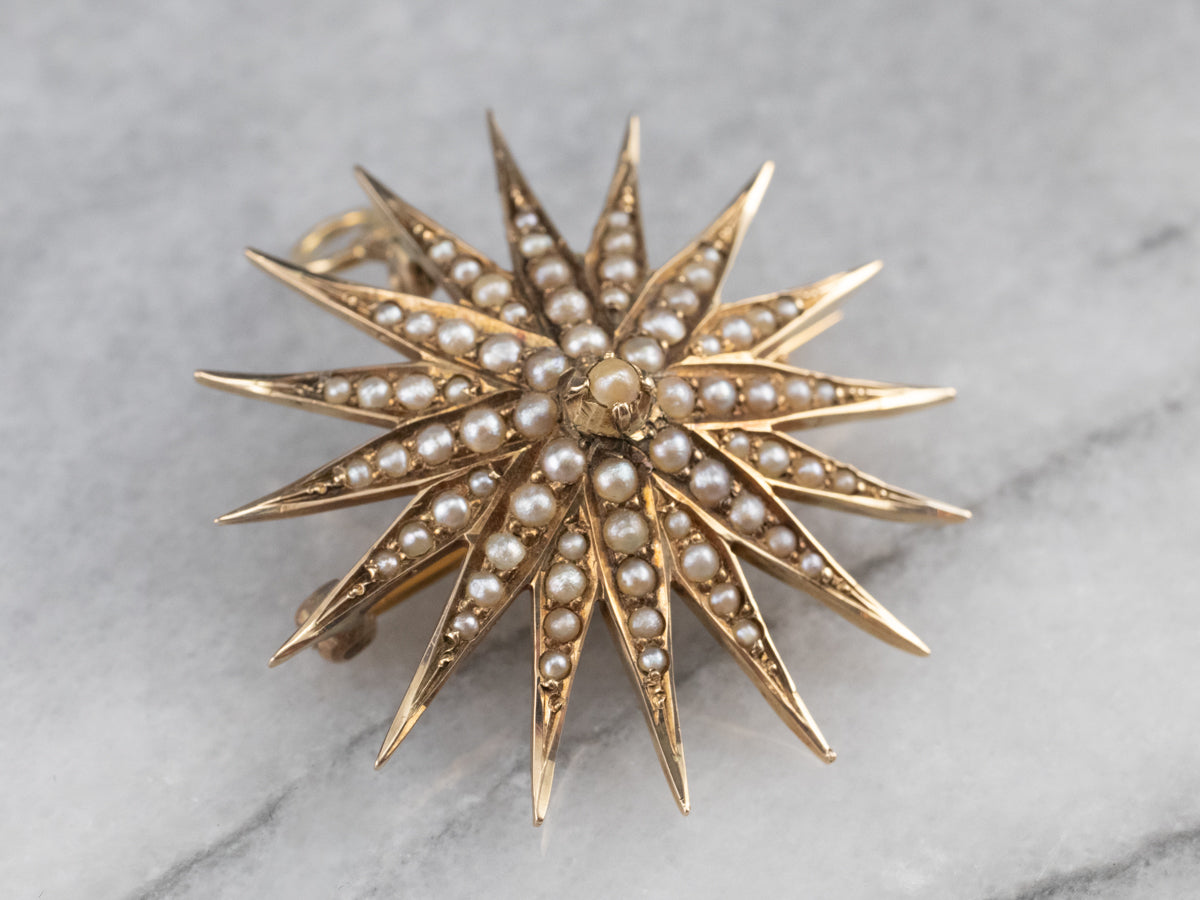 So beautiful and completely original! This rosy yellow gold brooch dates to the late 1800s. It's paved with seed pearls, each one individually set in its own little mounting. Immaculately crafted and in wonderful condition this piece will become a welcomed addition to one's antique jewelry collection!