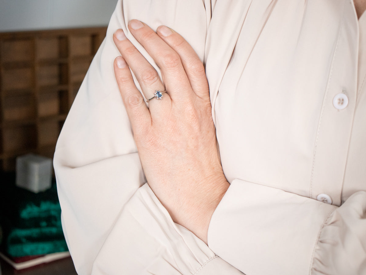 This pretty aquamarine features incredible faceting, making the stone glimmer and shine in any light. A halo of glittering diamonds forms the perfect framework, creating an airy and light structure to hold the center stone. This combination of colors is perfect, a cool and sophisticated blue and white that will be easy to wear for any occasion.
