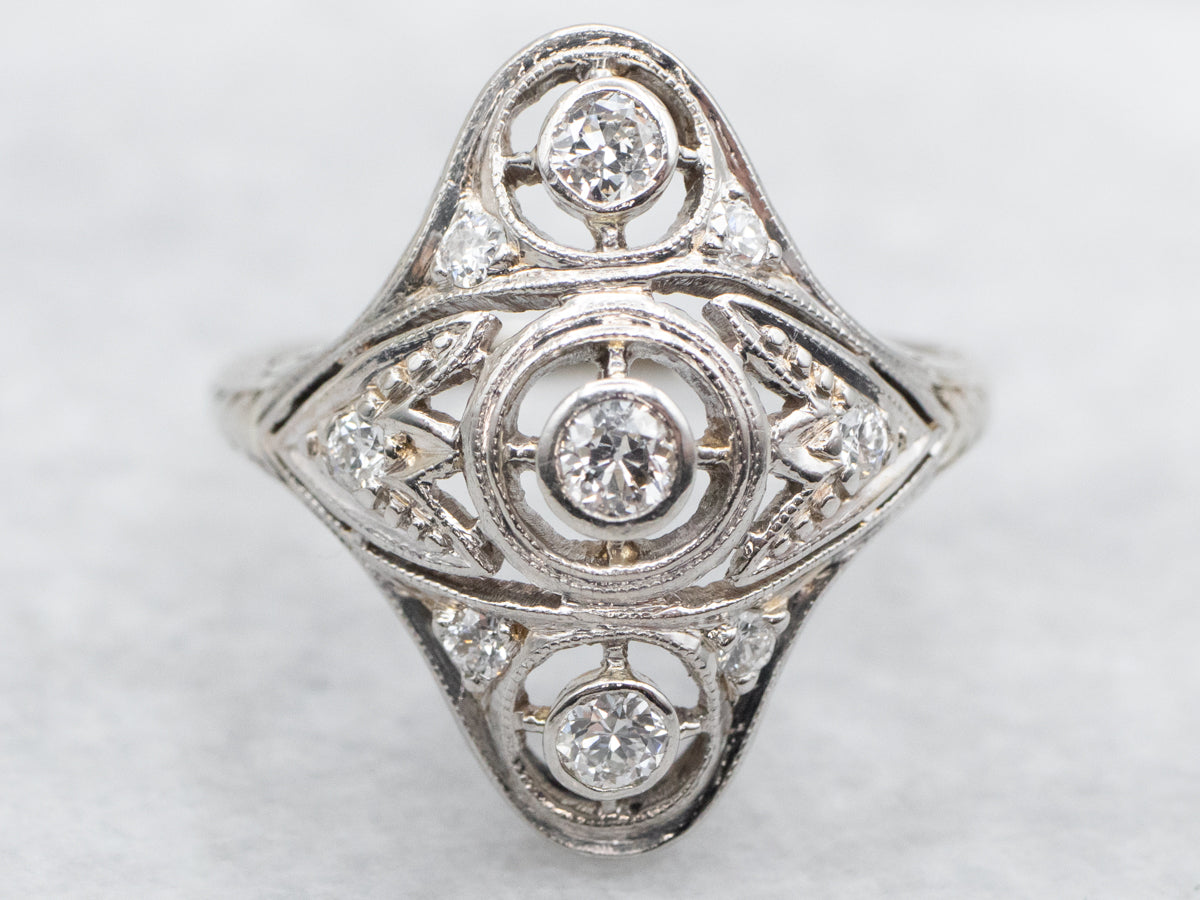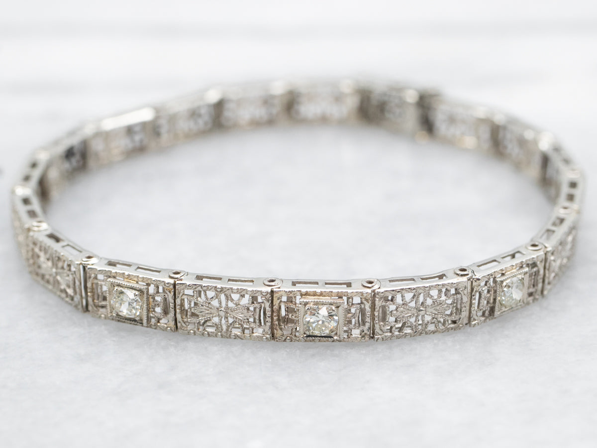 Timeless Art Deco, this antique European cut diamond bracelet is in great condition for its nearly 100 years of wear. The base of the bracelet is 14-karat white gold, and the details of the floral filigree are sweetly stunning and really show up clearly thanks to the visibility of the skin as a canvas behind the metalwork.