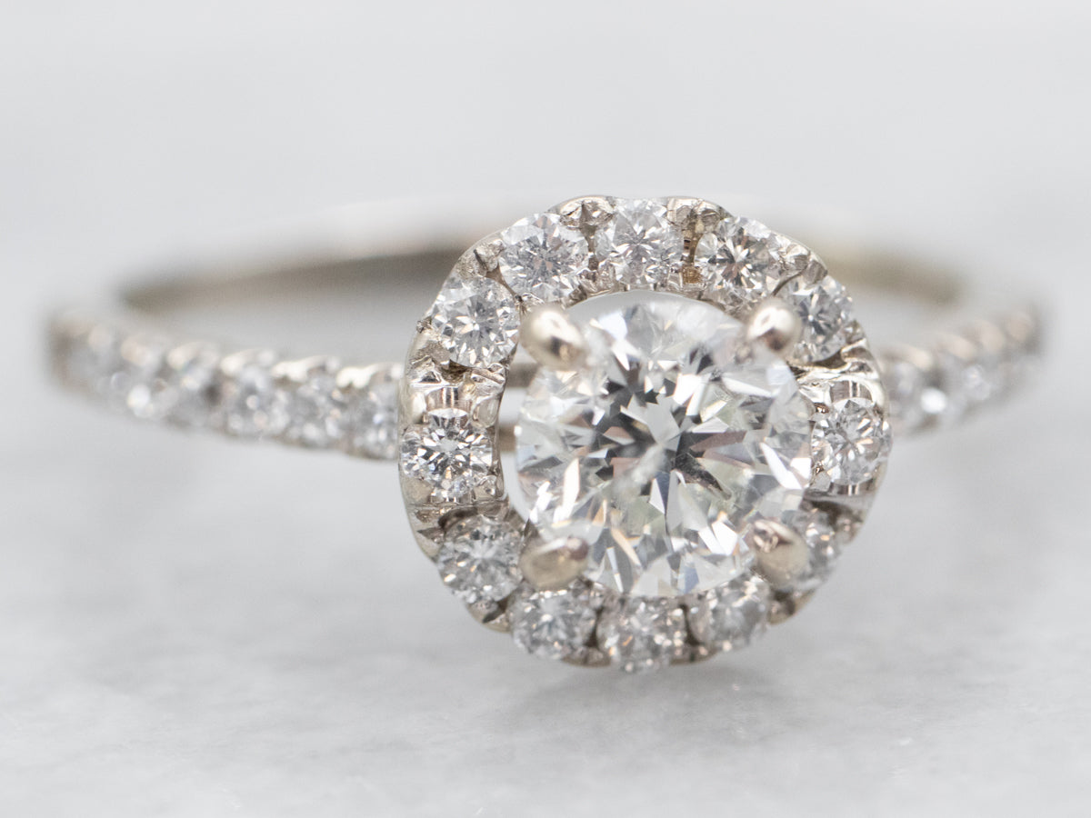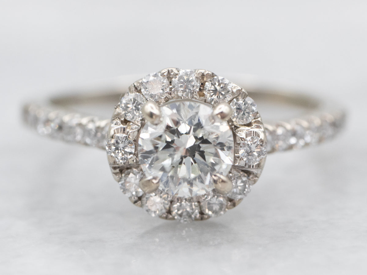 Allow your special someone to shine like the diamond she is with this stunning white gold engagement ring! Showcasing a brilliant diamond at its center with an halo of additional diamonds and diamond shoulders, this ring is sure to make any proposal unforgettable.