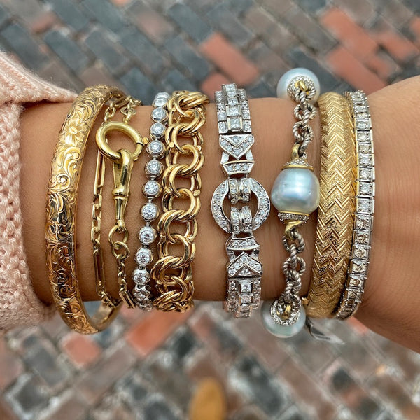 Classic Art Deco, this antique diamond bracelet is in great condition for its nearly 100 years of wear. The base of the bracelet is 10-karat white gold, and the details of the floral filigree are sweetly stunning and really show up clearly thanks to the visibility of the skin as a canvas behind the metalwork.