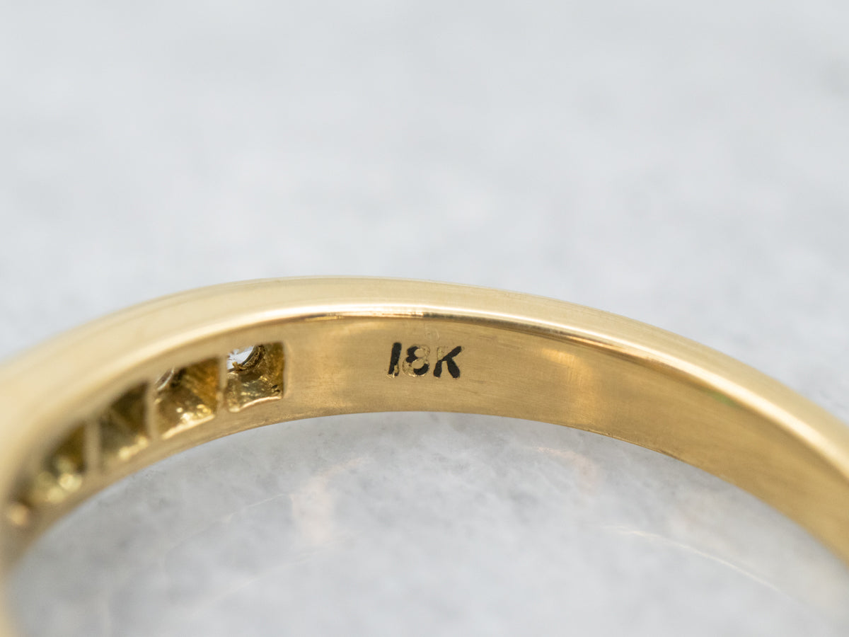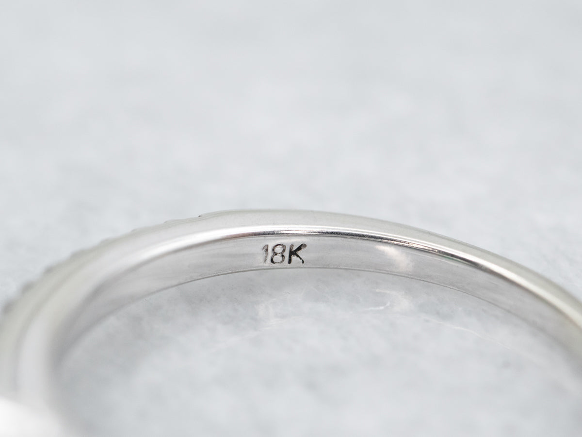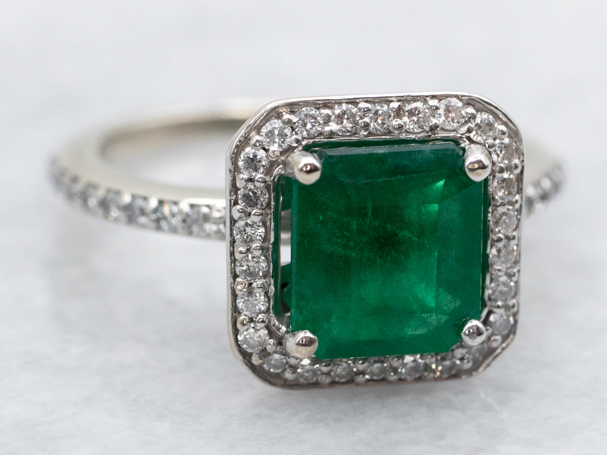 Rows of white gold and bright diamonds give this ring a luxurious glittering profile! The emerald at the center is a wonderful complement, a richly hued stone that flashes with a bright green light. Elegant and yet eye-catching, this vintage ring would look right at home on a Hollywood red carpet, yet can be worn more casually with ease.