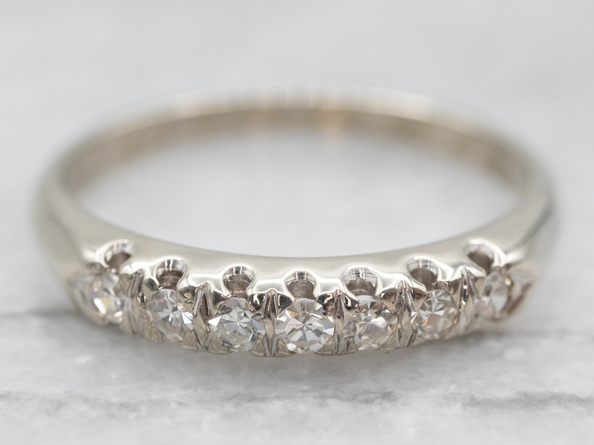 Metal: oro blanco de 14 quilates. Gema: 5 diamantes con un total de 0,27 quilates, SI en claridad, H en color Medidas de la gema: 2,7 mm, redonda Tamaño del anillo: 5.75 Marcas: "14K" estampado en la banda interior