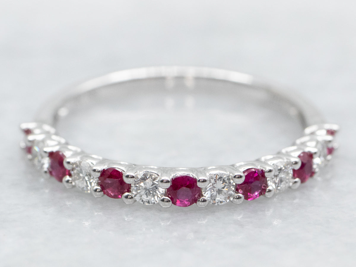 Elaborada en oro blanco brillante, esta exquisita alianza presenta la combinación perfecta de rubíes y diamantes. Con su elegante diseño, seguramente añadirá un toque de glamour a cualquier conjunto. Ya sea que se use sola o combinada con otros anillos, ¡esta banda es imprescindible para cualquier colección de joyas!
