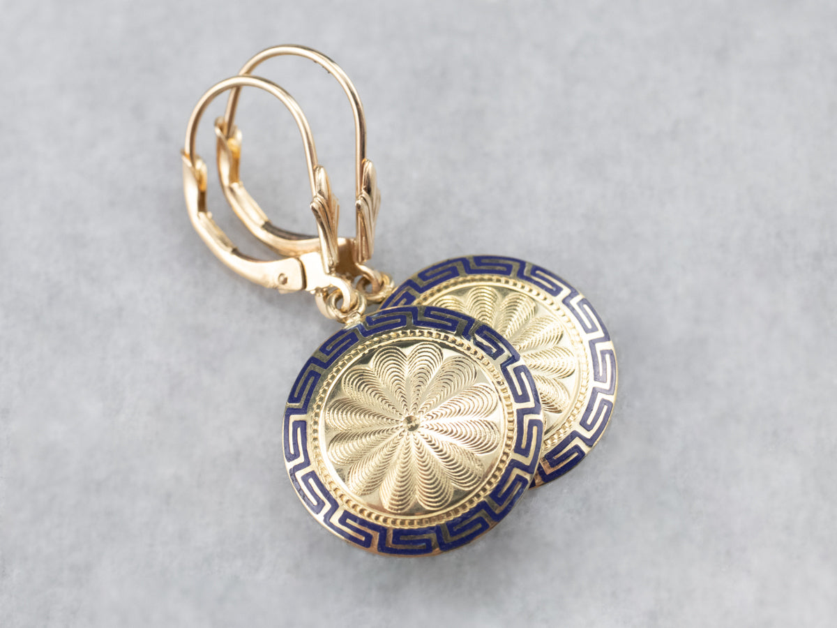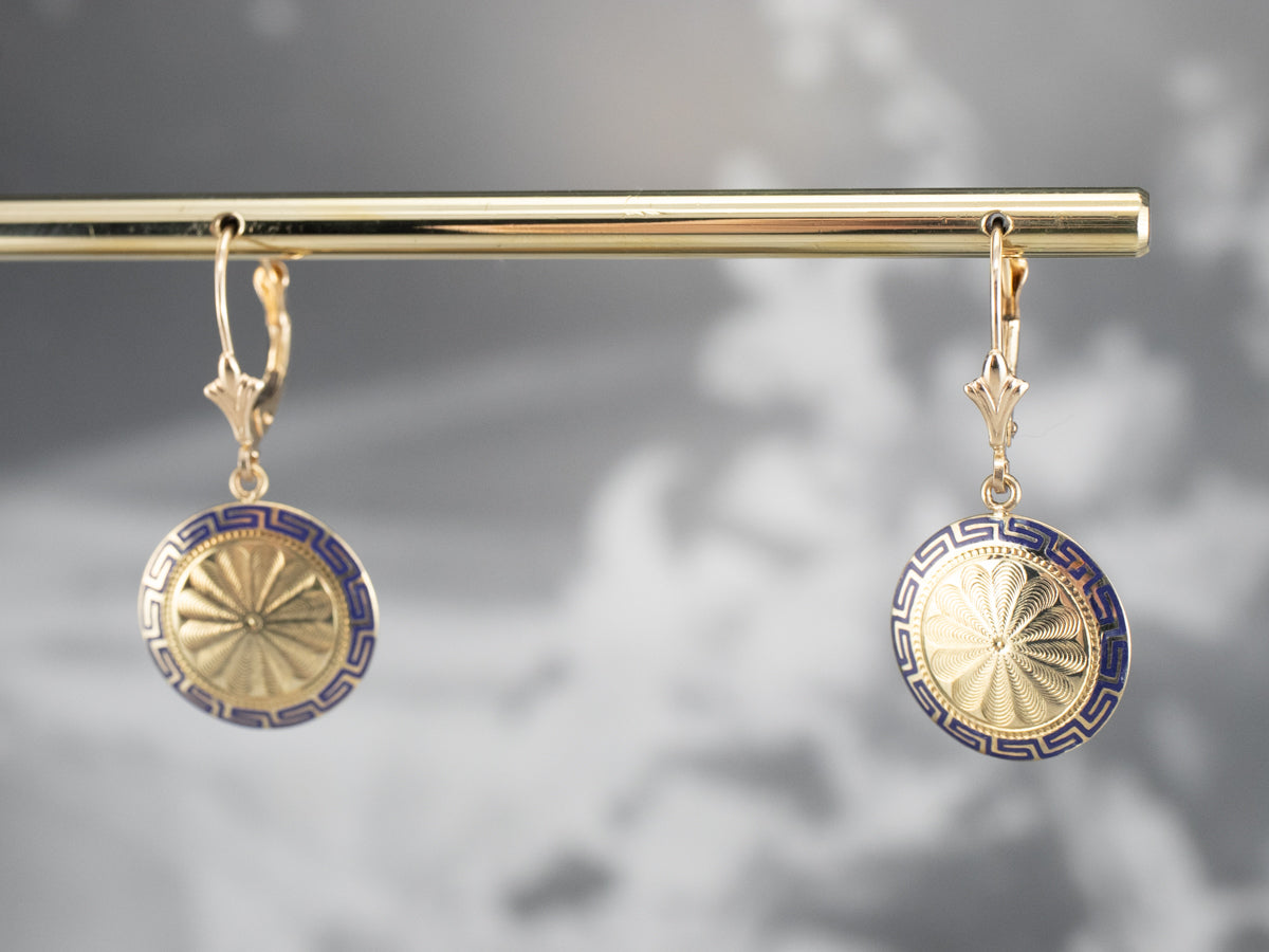 ¡Estos hermosos aretes fueron hechos a mano por nuestro estudio, usando piezas de gemelos antiguos! ¡Los hermosos y sofisticados colgantes son de un hermoso oro amarillo bordeado con un patrón de clave griega de esmalte azul real! ¡Perfectamente pulidas, estas gotas están listas para usar o regalar!