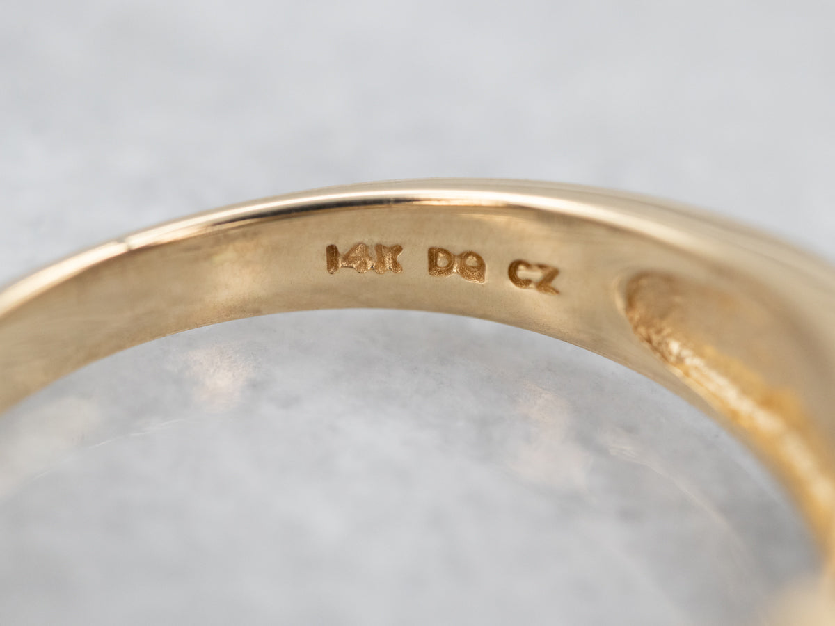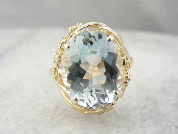Un halo de filigrana dorada rodea este precioso topacio azul. ¡Con hombros calados, esta pieza seguramente hará una declaración!