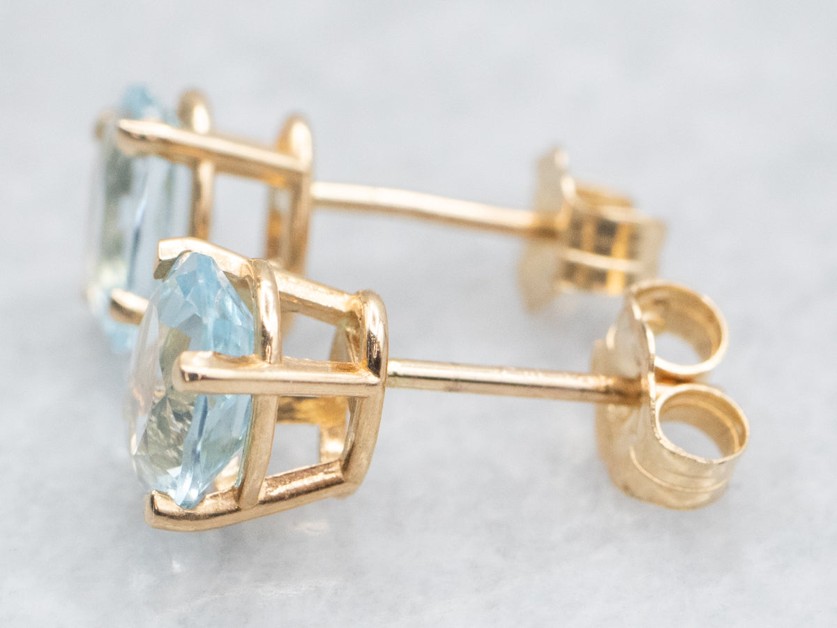 Metal: oro amarillo de 14 quilates. Gema: 2 topacios azules con un total de 2,08 quilates Medidas de la gema: 5,9 mm, redonda