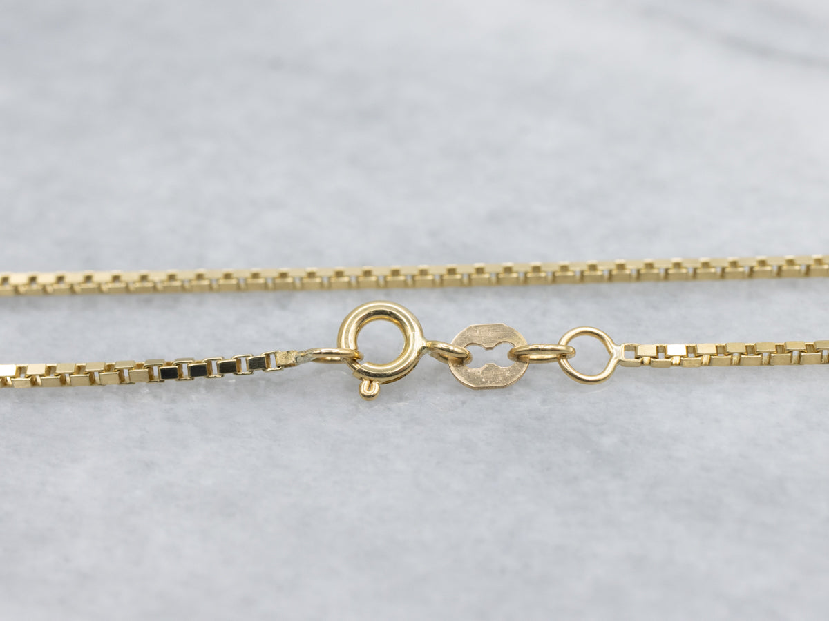 This 18K yellow gold box chain showcases meticulously linked construction with a secure spring ring clasp. Perfect for layering or showcasing a pendant, it combines timeless elegance with reliable craftsmanship.