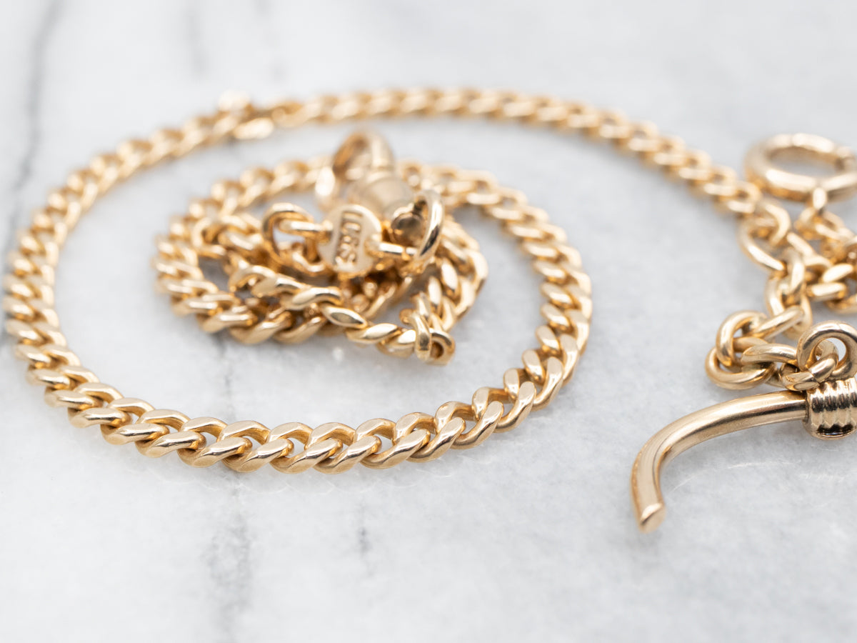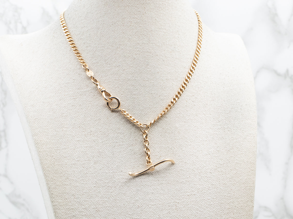¡Esta cadena atemporal es una pieza robusta de la época victoriana elaborada en oro amarillo de 14 quilates! La artesanía es excelente, su sencilla barra en T y su cierre de anillo de resorte de gran tamaño hacen de esta pieza una opción versátil que puede combinarse con varios relojes de bolsillo o colgantes.