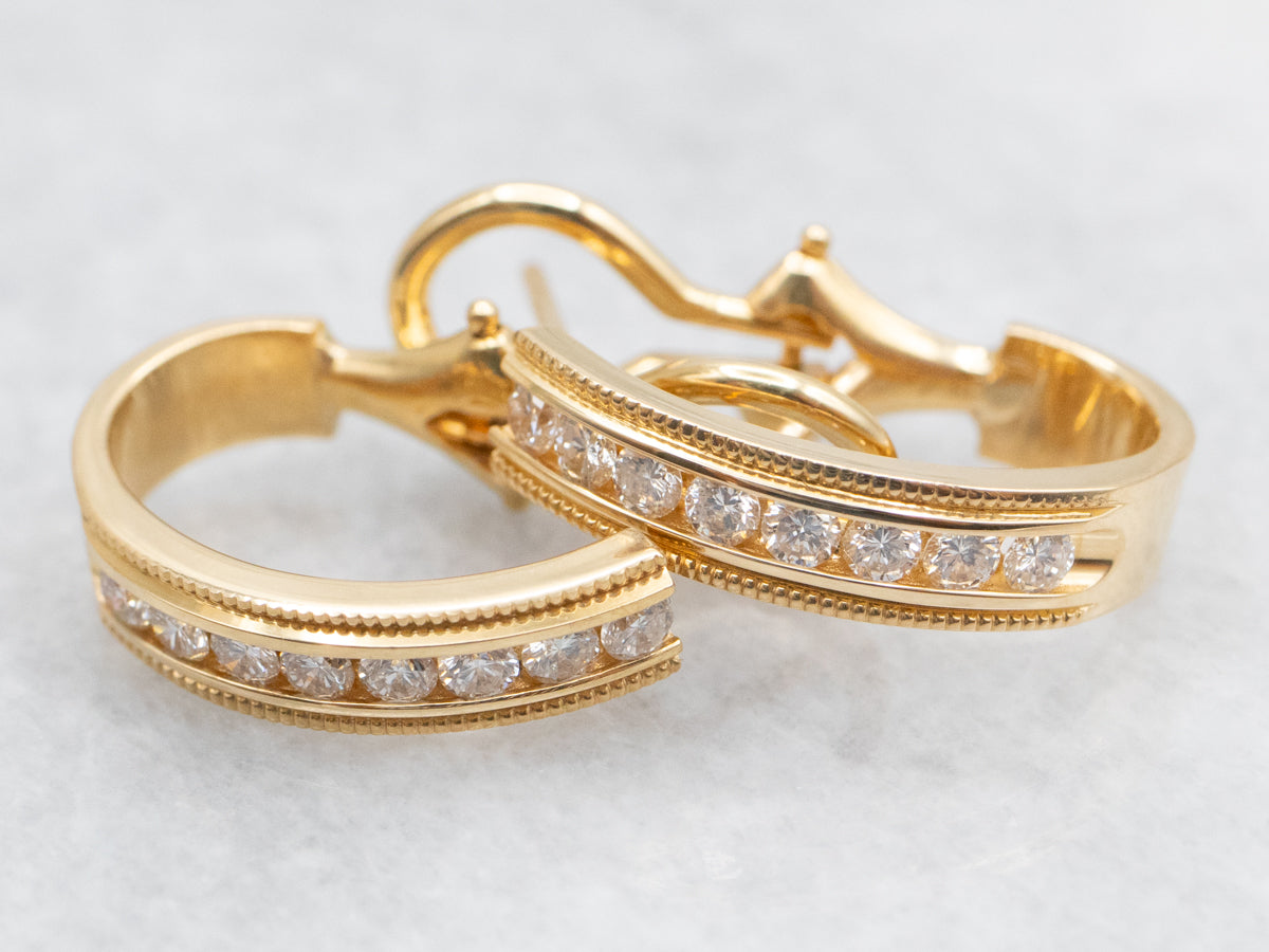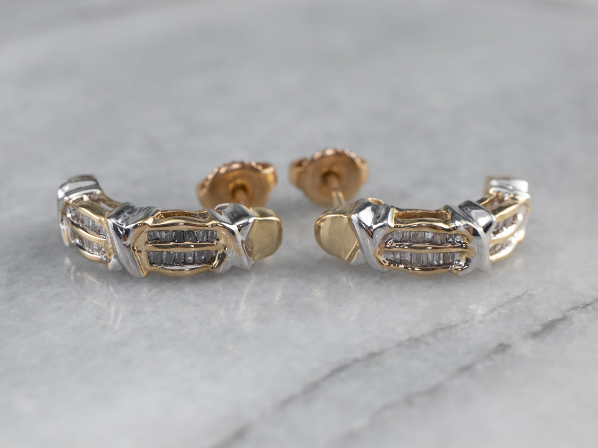Metal: oro amarillo de 14 quilates. Gema: Diamantes con un total de 0,84 quilates, VS-I en claridad, HI en color Medidas de la gema: 2,2 x 1,7 mm, talla baguette Medidas: 11 x 27 mm Marcas: "14K" estampada en el reverso.
