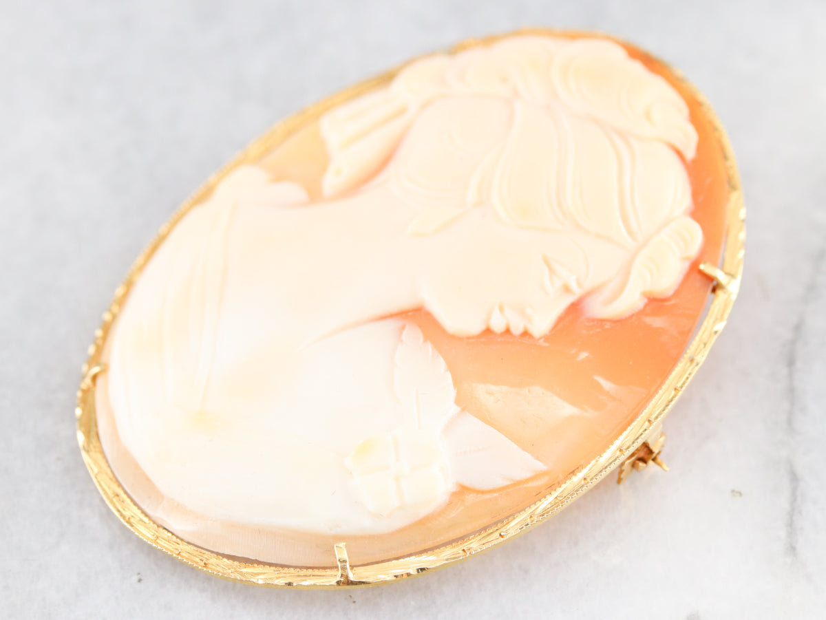 Clásico Art Déco, este pin de oro amarillo tiene un estilo romántico. Los cuatro lados están decorados con lazos tradicionales, dándole un aspecto femenino. La concha está intrincadamente tallada, con maravillosos detalles en el cabello, esta pieza se puede usar como alfiler o colgante.