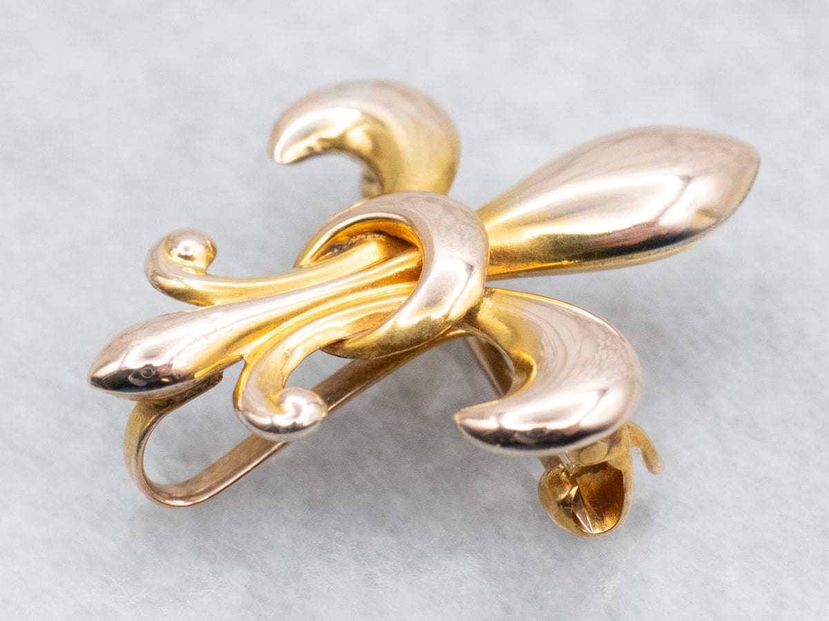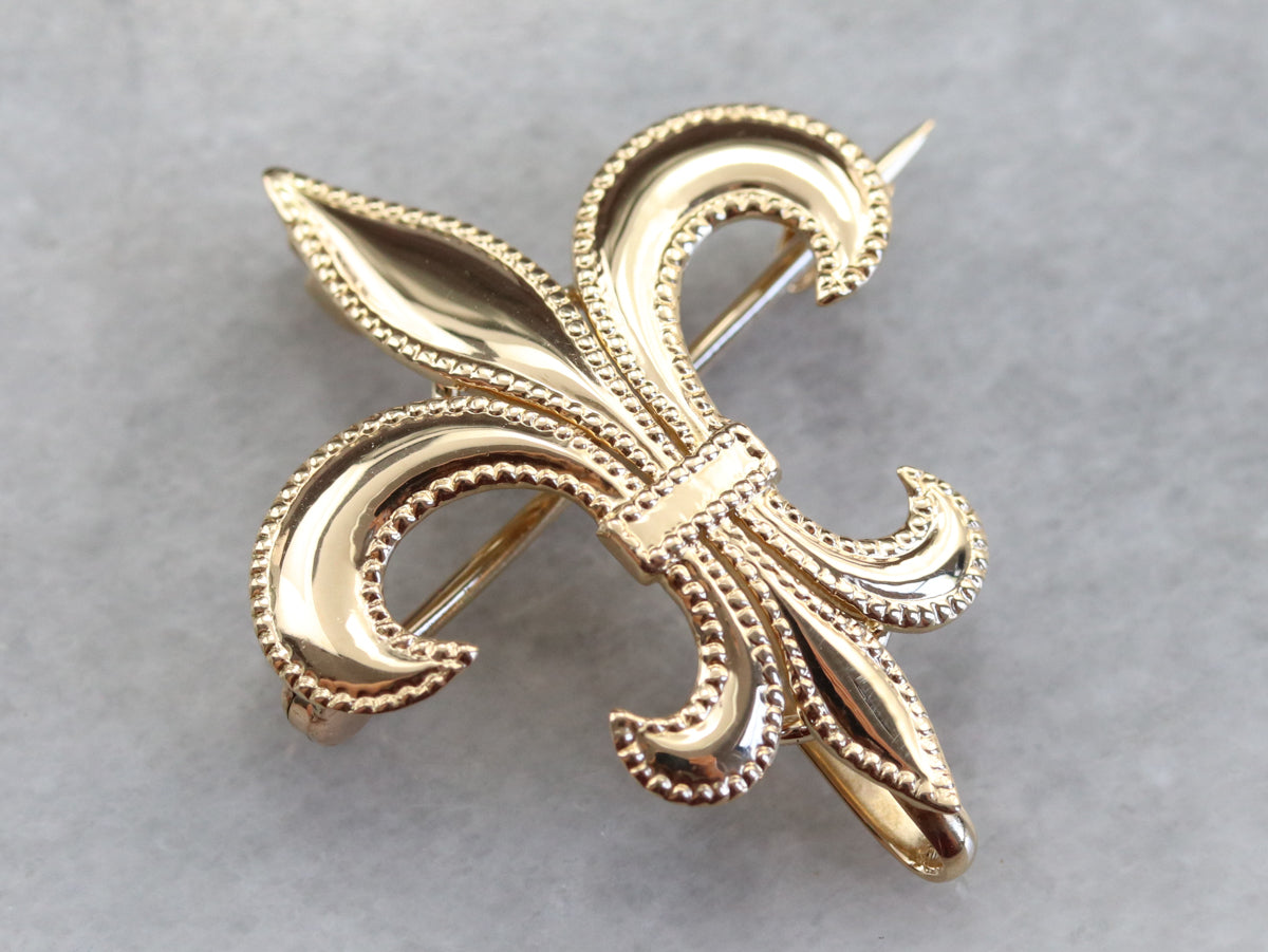 A classic motif, this versatile Fleur De Lis brooch has a hook on the back. This hook, hidden from view from the front, can be hung with a pendant, charm, or small pendant watch!