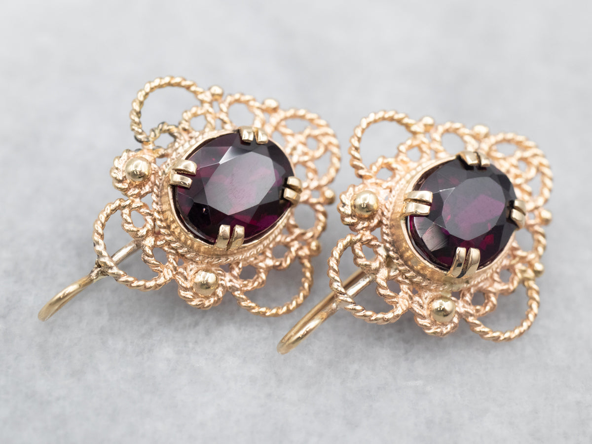 Estos relucientes aretes colgantes de granate rojo sangre presentan un brillo y una luz que no son típicos de los granates carmesí profundos. Hemos elaborado estas gotas a partir de piezas de oro antiguo, que contrastan maravillosamente con el color de la piedra. ¡Estos aretes se pueden vestir formalmente o informalmente y combinar con múltiples atuendos!