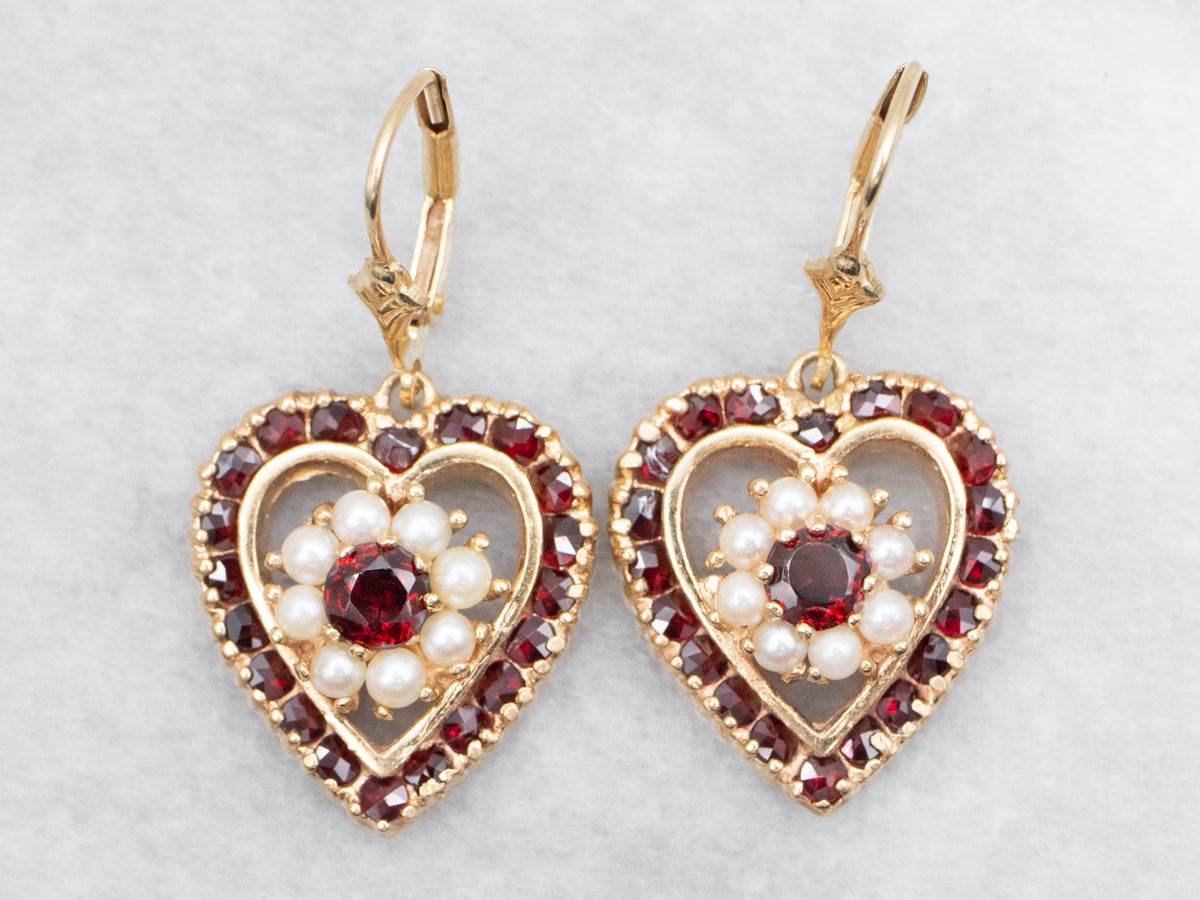 Pendientes colgantes de perlas de semilla y granate de oro amarillo brillante