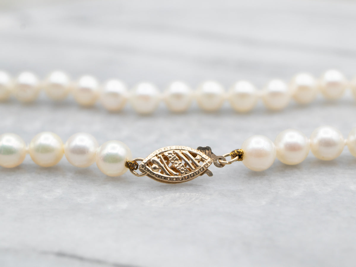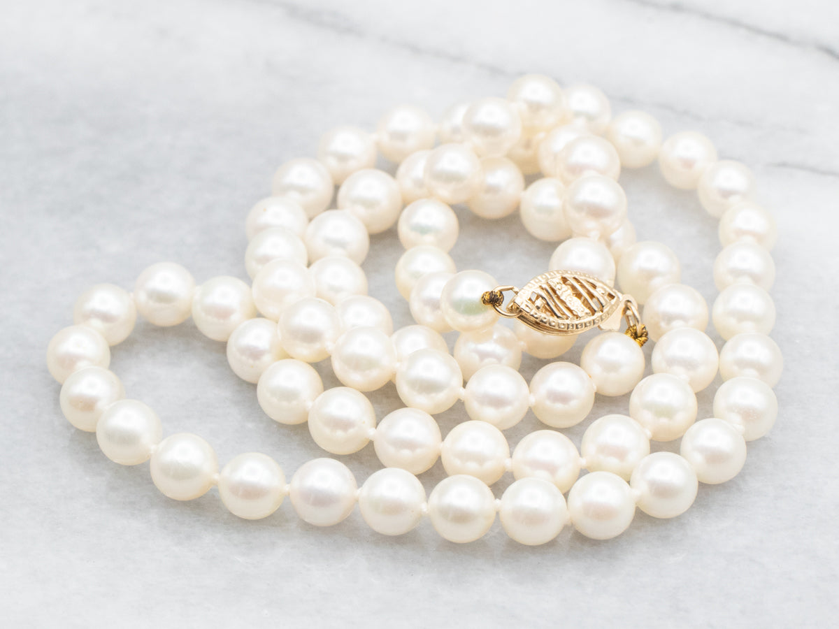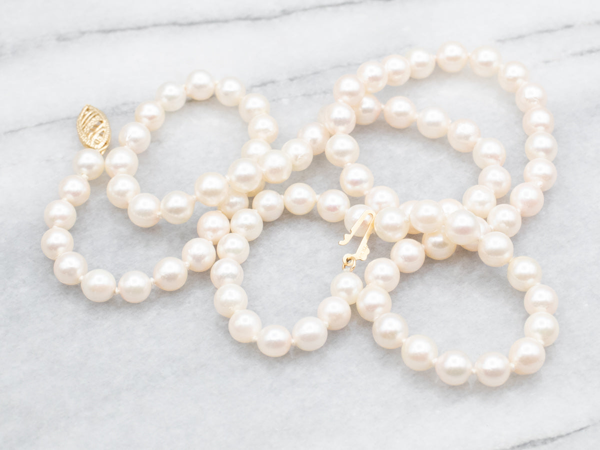 Metal: oro amarillo de 22 quilates. Gema: Perlas de agua salada Medidas de la gema: 7,5 mm, redonda Longitud: 17 pulgadas Marcas: "22K" estampada en el cierre.