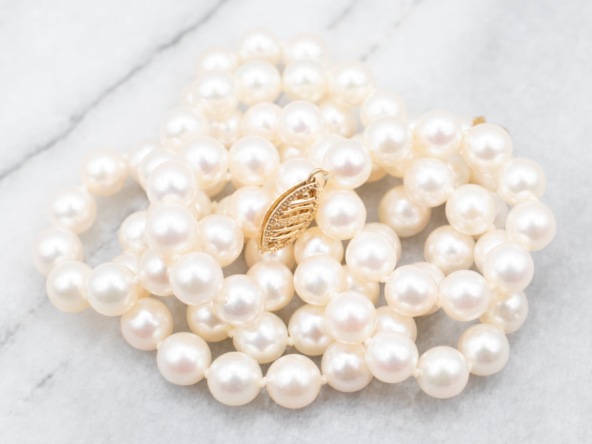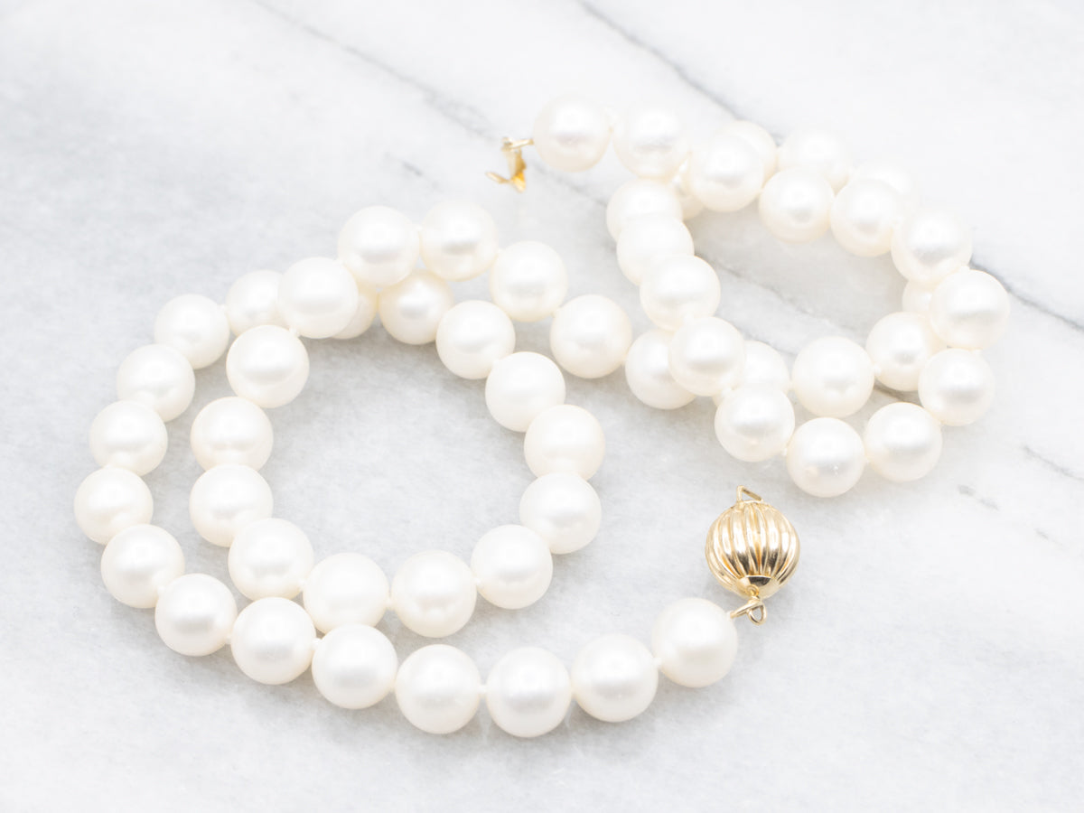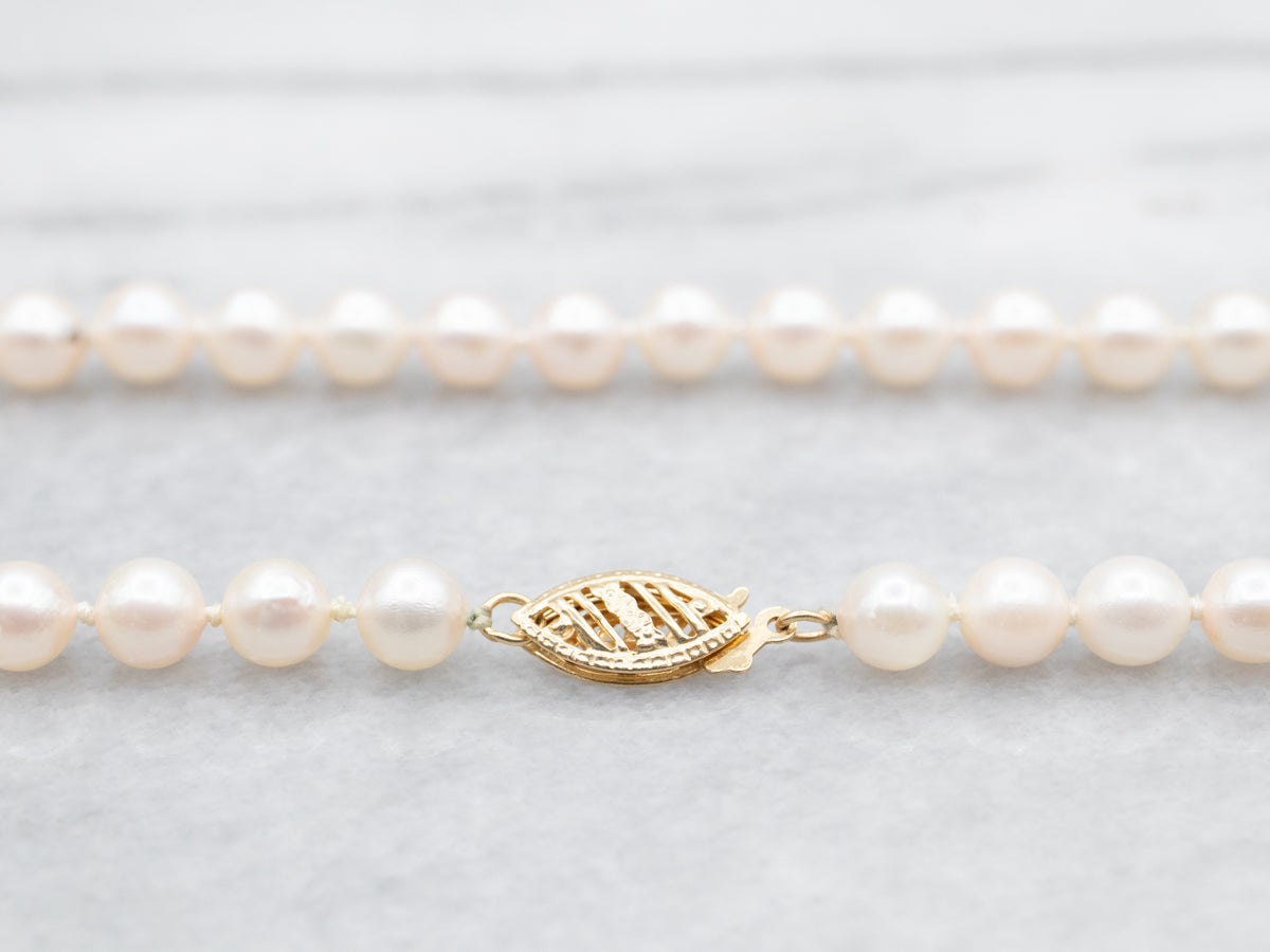 Metal: oro amarillo de 22 quilates. Gema: Perlas de agua salada Medidas de la gema: 7,5 mm, redonda Longitud: 17 pulgadas Marcas: "22K" estampada en el cierre.
