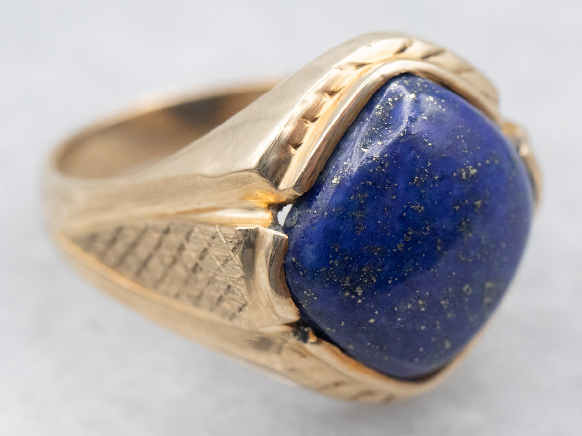 This yellow gold mounting compliments the lapis beautifully! Flecks of gold glitter across the stone, complimented by the warm yellow gold. This ring is ready for a night out, and sized for everyday wear.