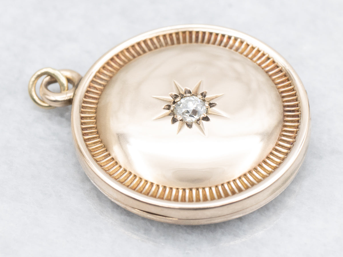 This stunning little trinket is a locket made for luck! Crafted from yellow gold, adorned with an Old Mine cut diamond, and featuring red and blue glass accents, it's a charmed jewel that will bring nothing but good luck! Rotate it around to see the initials "RPB to AML" engraved on the back—what a great way to keep a memory close to your heart.