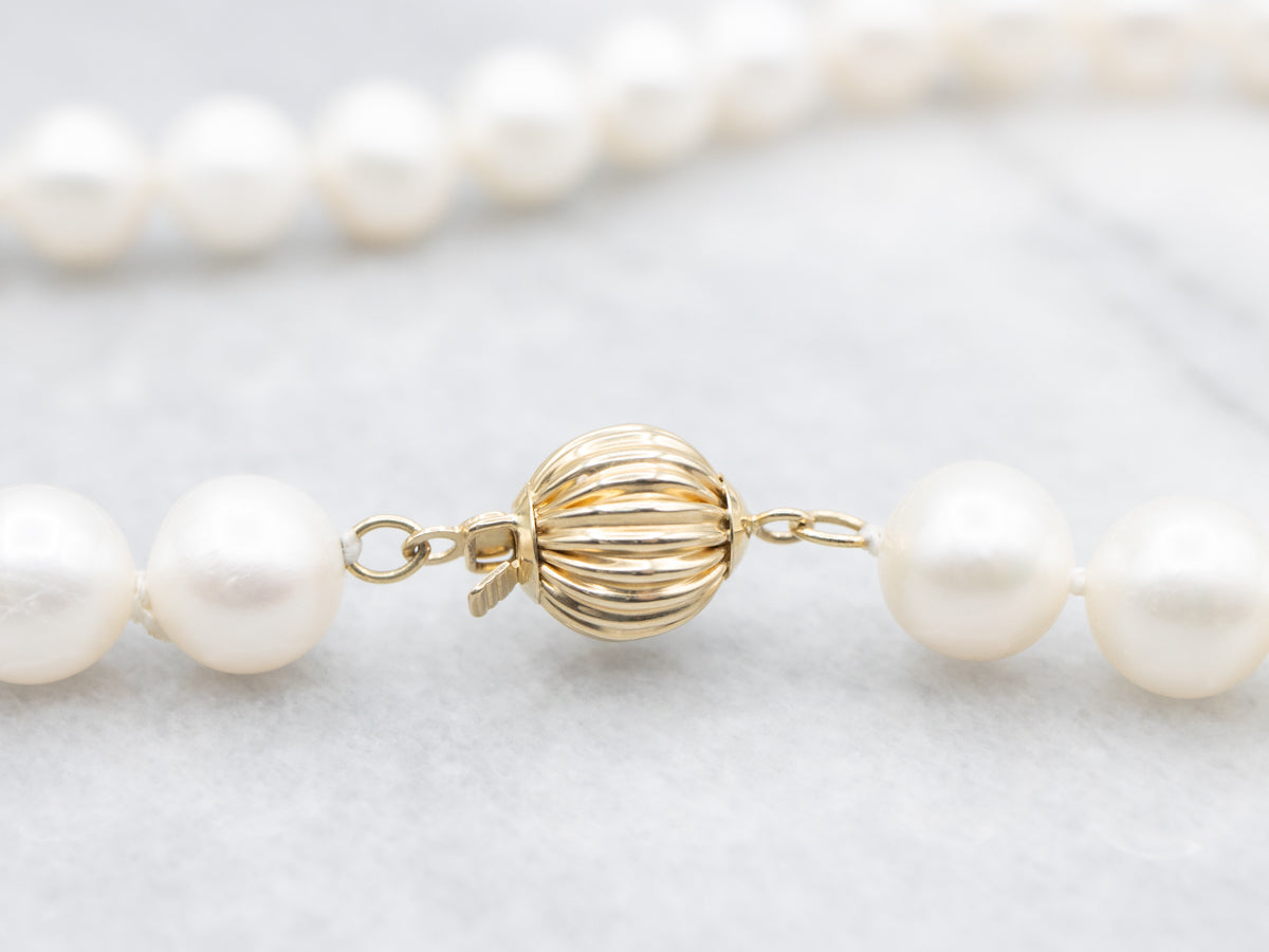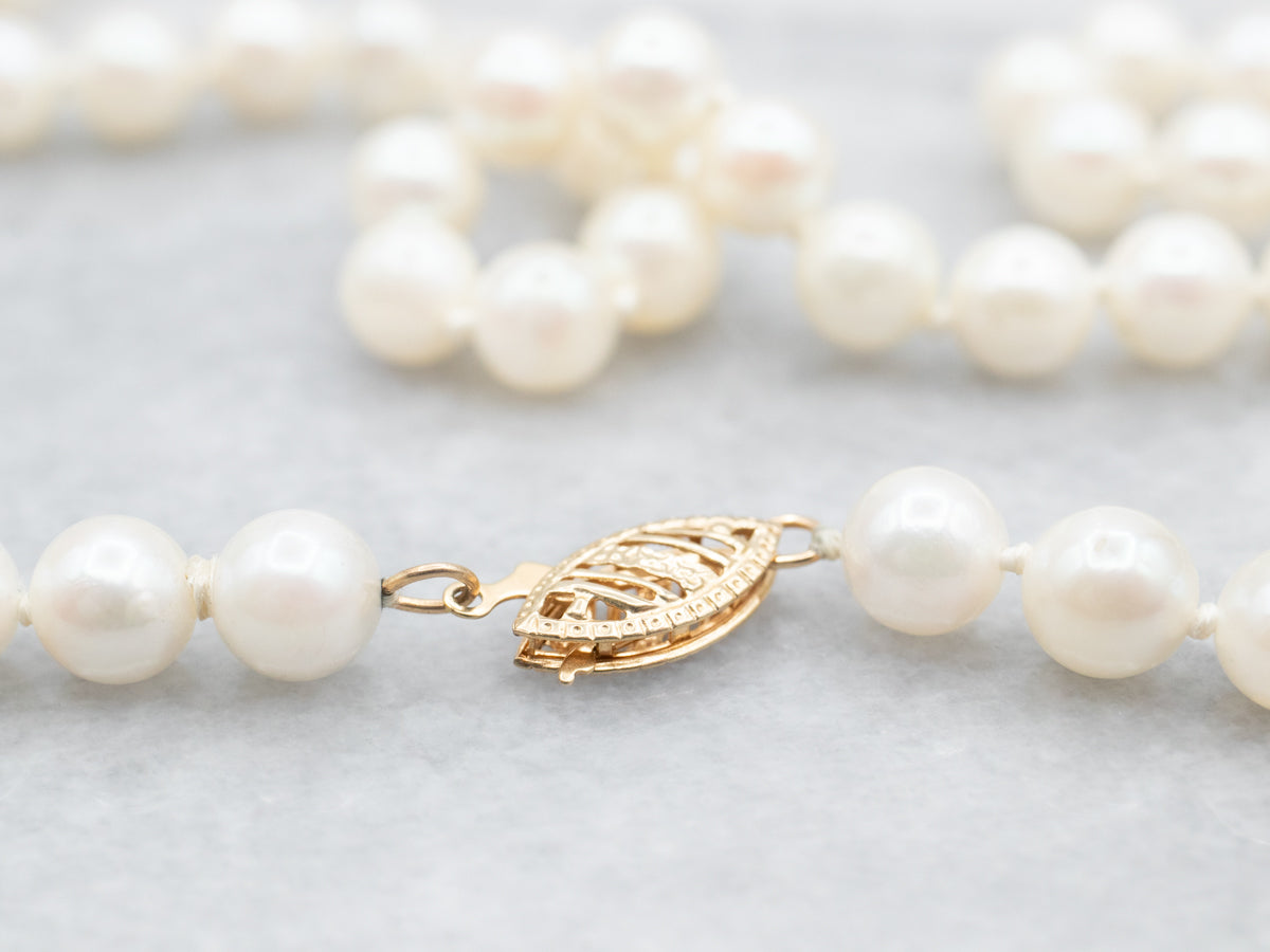 Beautiful saltwater pearls are a classic, and always a welcome gift! These pearls are crisp white, with just a hint of pink tint. This is of lovely quality, vintage pearls from the mid-1990s.