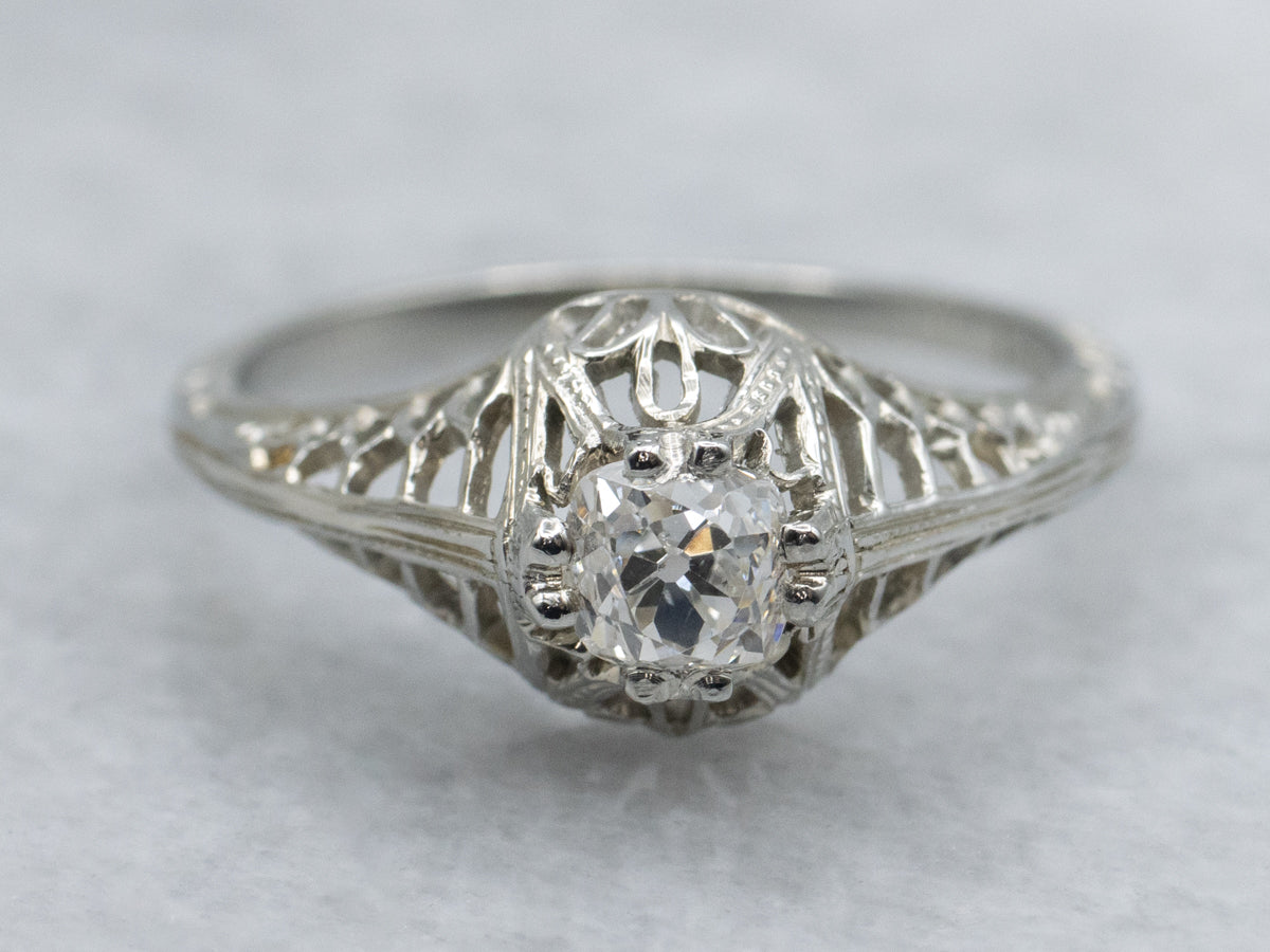 Art Deco engagement rings are known for their architectural design, die-stamped filigree, and milgrain detailing. We love Art Deco engagement rings for their intricate details and bold elegance.