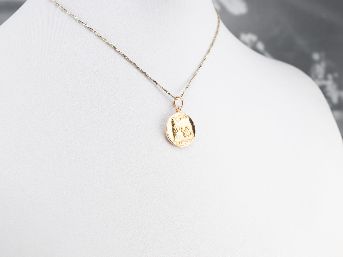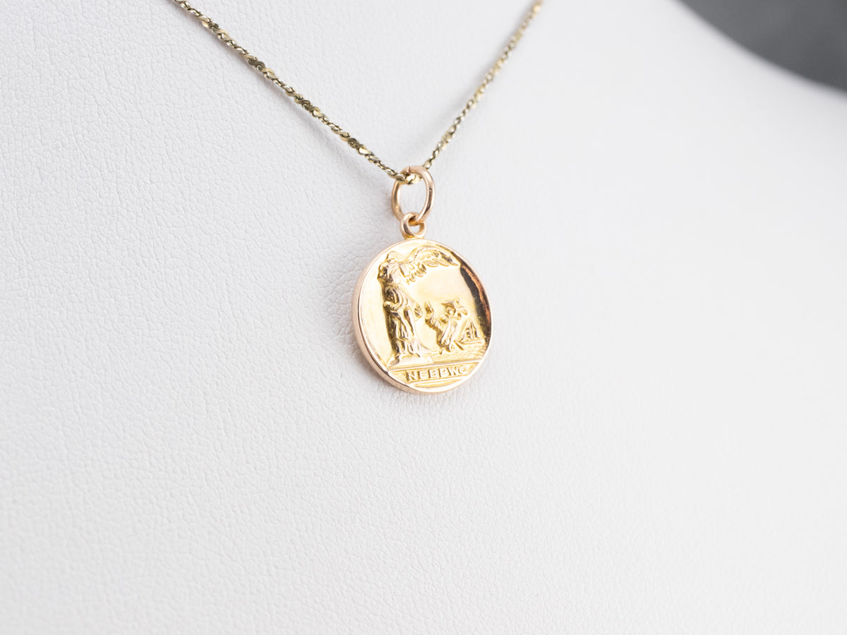 This medal pendant depicts the emblem of the National Federation of Business and Professional Women's Clubs. This piece is crafted from 10 karat gold and is the right size for wearing as a pendant on a chain or charm on a bracelet.