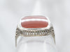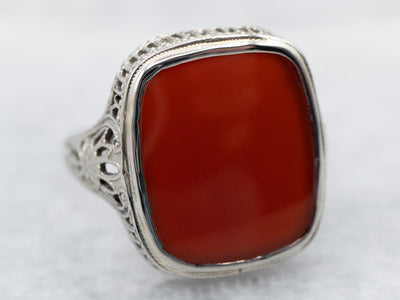 This stunning antique white gold solitaire ring is set with a rich, glowing carnelian cabochon. Carnelian has been used in jewelry since ancient Egypt, and the very finest quality, the most translucent and luminescent pieces, such as this, are extremely rare!