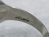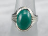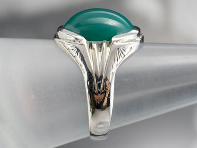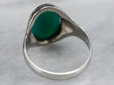 This vintage ring has a marvelous architecture to it! Structured lines and accents give this ring height and dimension that catches the light. The stone, a forest green onyx, fills with light around the edges, almost as if it were glowing!