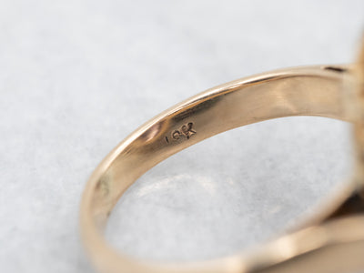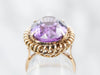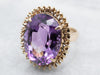 This ring is truly gorgeous! A large and beautiful deep purple amethyst sits in the center, with an amazing cut and vibrant purple color that flickers with bright pops of violet! The stone is expertly cut to really display the stone’s color and sparkle! The looping yellow gold mounting and simple prongs are all this stone needs to frame it to perfection!
