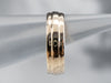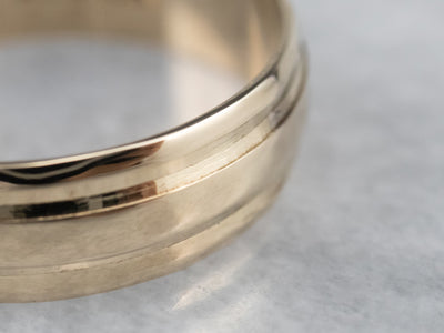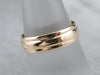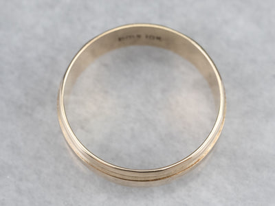 A series of simple lines give this vintage wedding band a sense of motion, of rippling gold that needs no gemstones to shine. This yellow gold band is sturdy and easy to wear, comfortable on the hand, and substantial enough to wear alone.