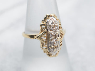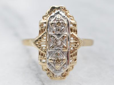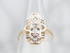 This fantastic dinner ring is crafted of lacey, yellow gold filigree with immaculate details. The center of the ring is set with sparkling champagne-hued diamonds in a placard of white gold, the better to shape and frame the round diamond that glitters under the prongs!