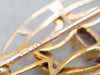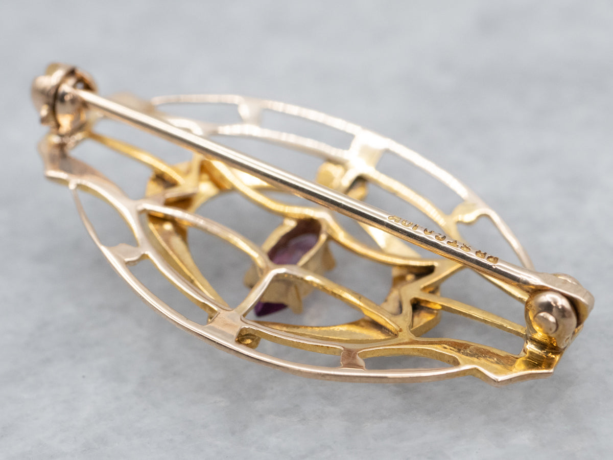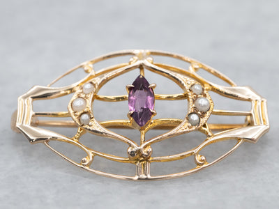 This antique brooch is exquisite! A marquise-cut amethyst glass stone forms the centerpiece, set into sophisticated filigree, and flanked by natural seed pearls. A delicately designed frame of gold echoes the feminine lines and elegant balance of the center.