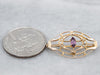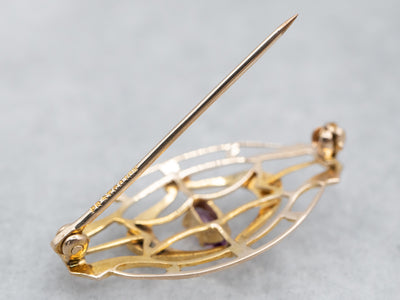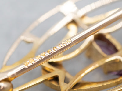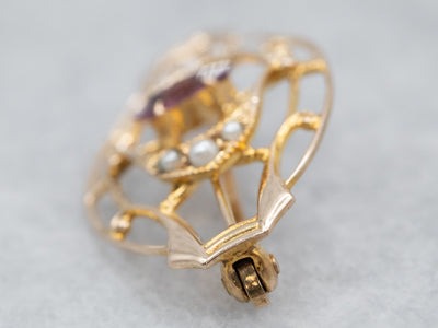 Metal: 10K Yellow Gold Gem: Amethyst Glass Gem Measurements: 5.8 x 2.8 mm, Marquise Cut Accents: 6 Seed Pearl Measurements: 28 x 15 mm Marks: “PR ST CO 10K” Stamped on the reverse