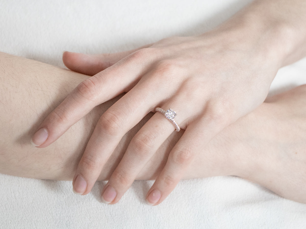This GIA-certified diamond engagement ring is classic with a twist! When worn, the band displays as a seamless row of glittering diamonds, anchoring the brilliant color and clarity at the center. Even more, diamonds are set into the profile of the ring, allowing it to sparkle from every angle.