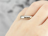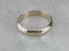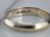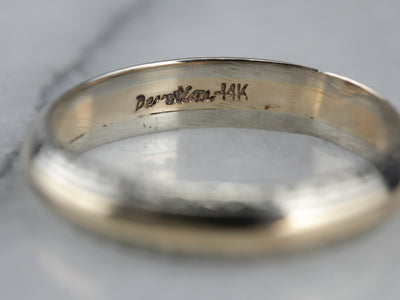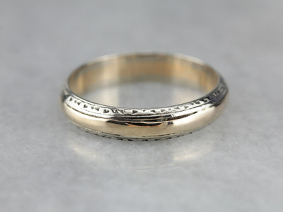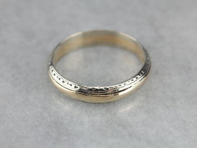 This vintage band is crafted entirely of 14k gold, with white gold forming most of the ring, and yellow gold creating a bright, shining center. The center of this ring is slightly domed, giving it the ability to catch the light and accented by the geometric carvings on the edge. This is stamped on the inside with the name of the manufacturer, Devotion.