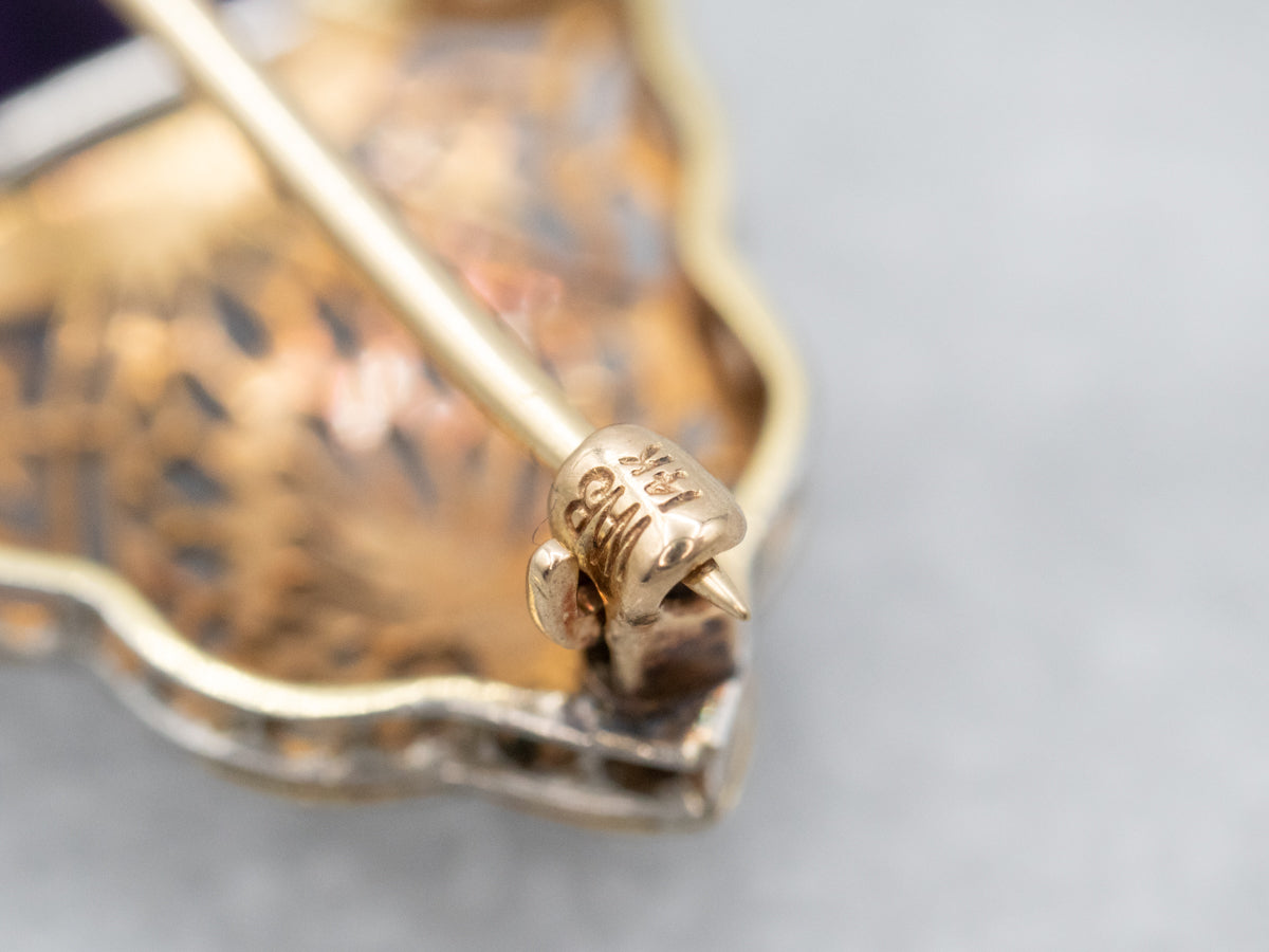 The delicate, lace-like filigree of this amethyst pin is the very definition of the Art Deco era! Created by die stamping, even the finest filigree of this era is incredibly strong and tough. Feminine and dreamy, this pin will look worn in a lovely way on a lapel or sweater... or even on a wedding veil or bouquet ribbon!